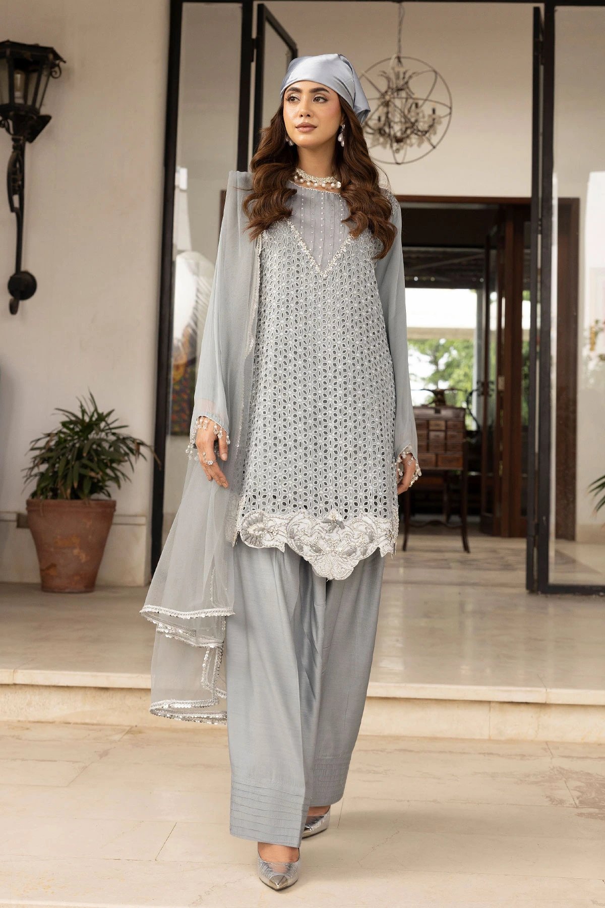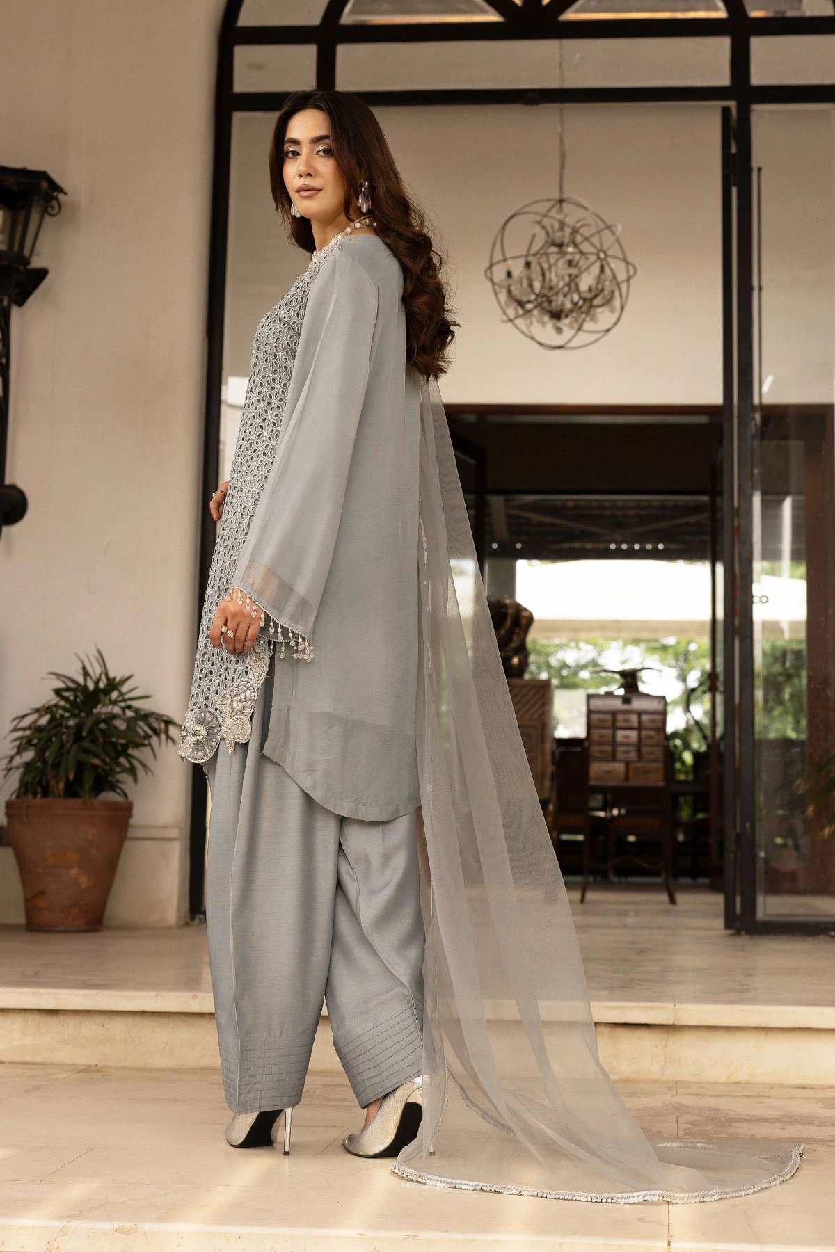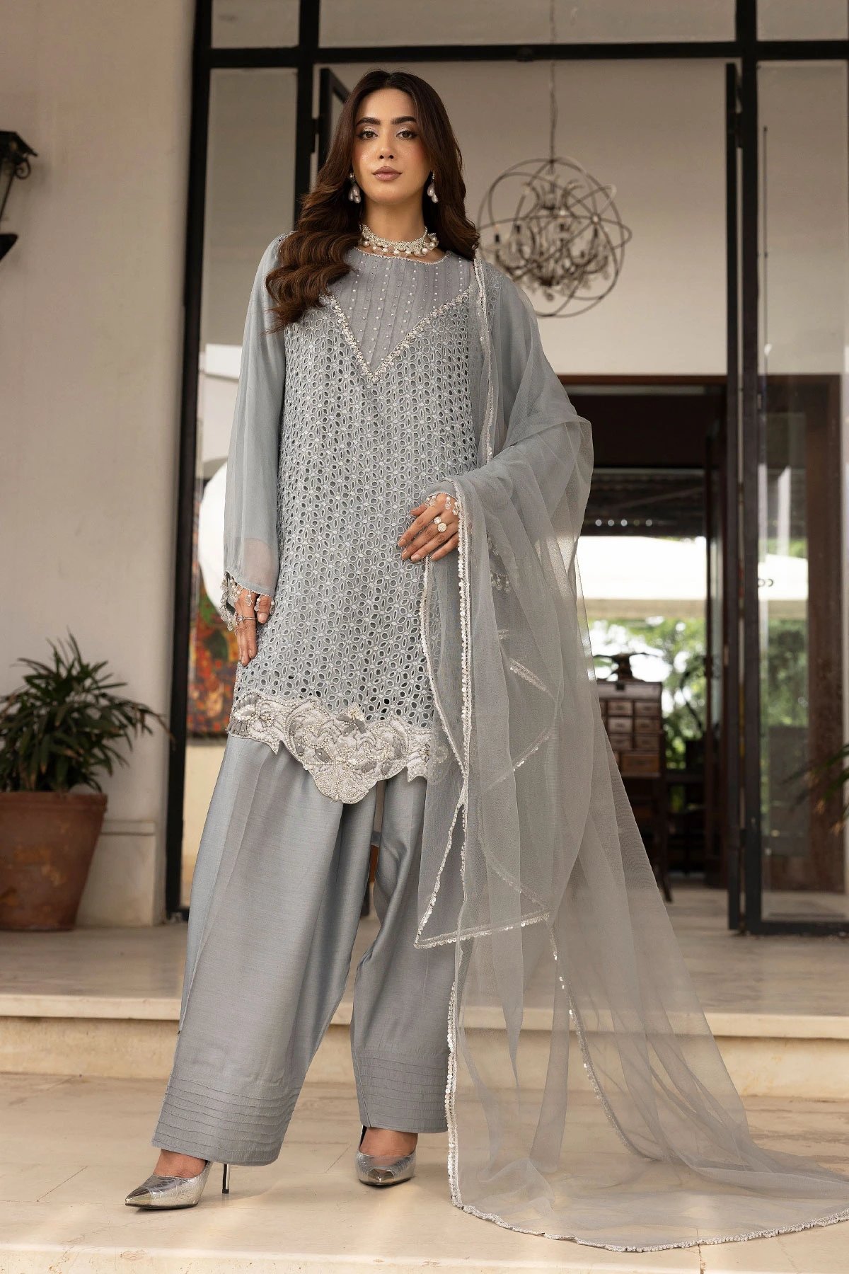This beautiful 3 piece chiffon suit features a straight chikankari embroidered shirt with luxury embroidered front, finished with full length sleeves, Paired with a crepe farshi shalwar. The look is finished with a net dupatta with sequence embroidered border.