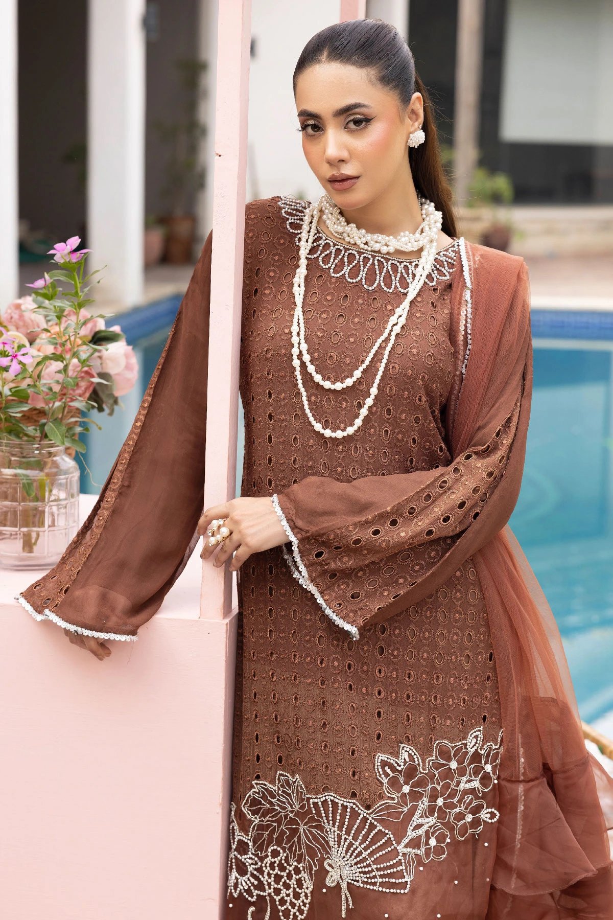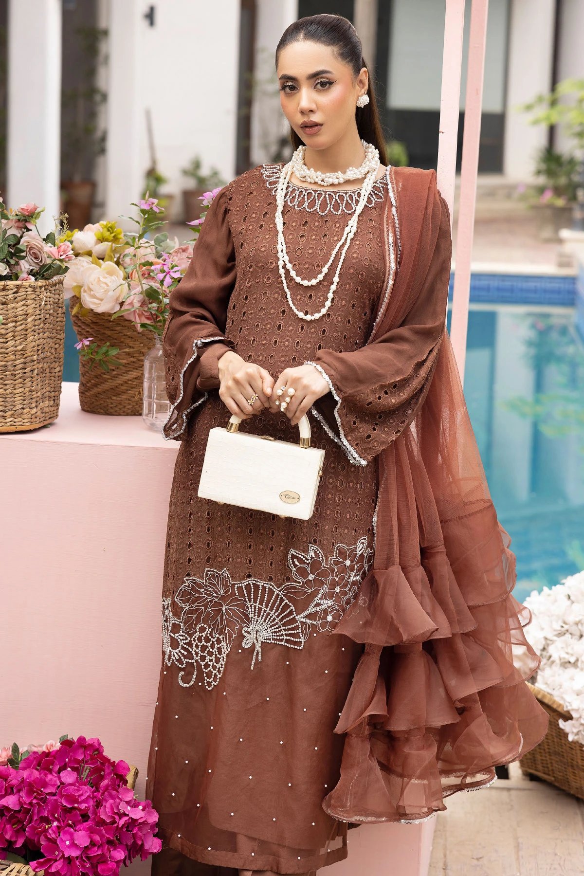 This beautiful 3 piece chiffon suit features a straight chikankari embroidered shirt with luxury embroidered neckline and border, finished with full length sleeves, Paired with a crepe plazo trousers. The look is finished with a net frilled dupatta.