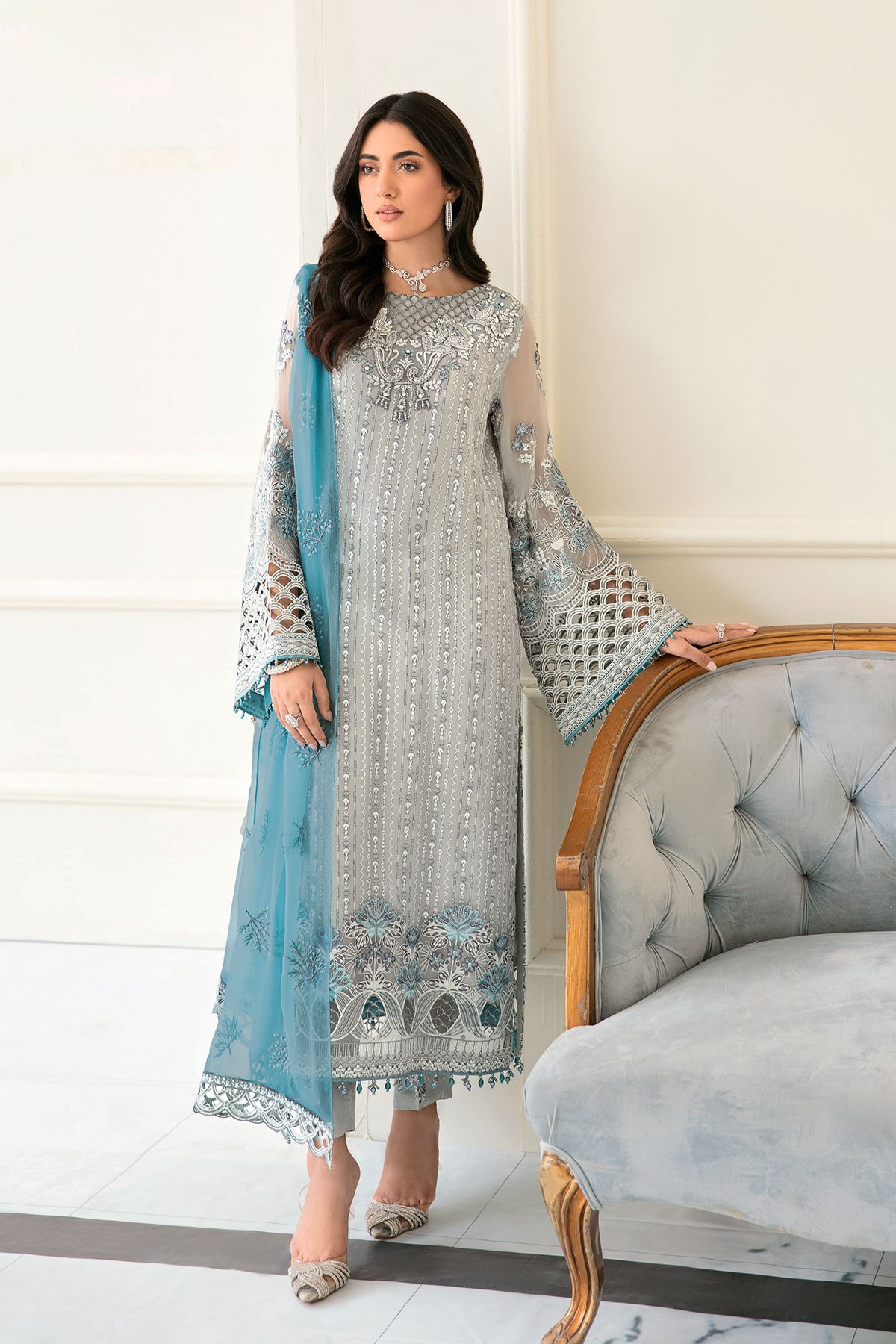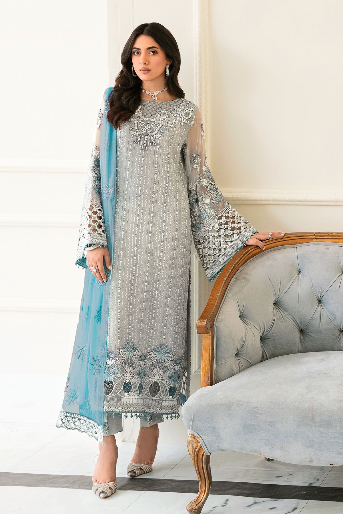 This beautiful Sienna collection features a straight shirt with luxury thread work embroidery throughout with bead embellishments on the neckline and border. It comes with full length embroidered sleeves with cut border on the cuffs. It comes with straight leg crepe trousers and the look is finished with a contrasted organza embroidered duppta. Perfect mother and daughter collection for this season. Note: Above catalogue pictures are for design reference only.