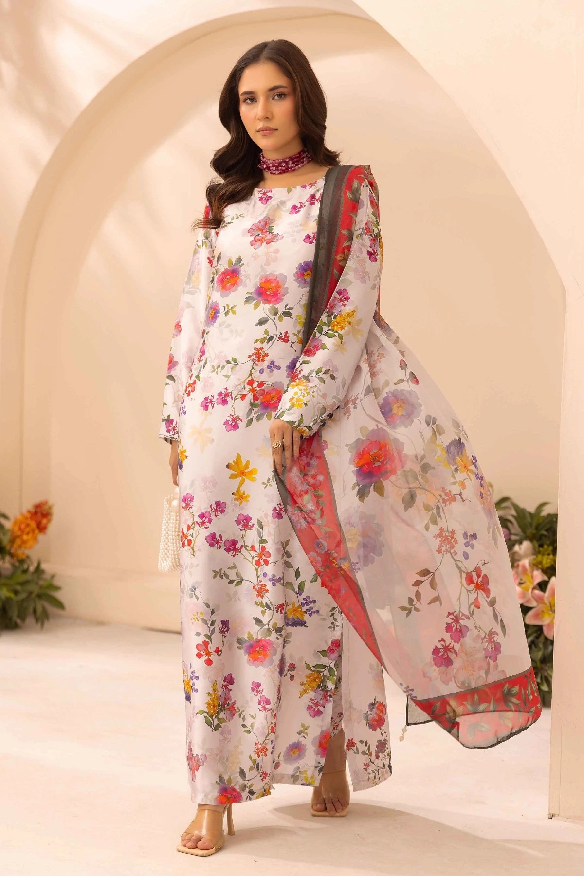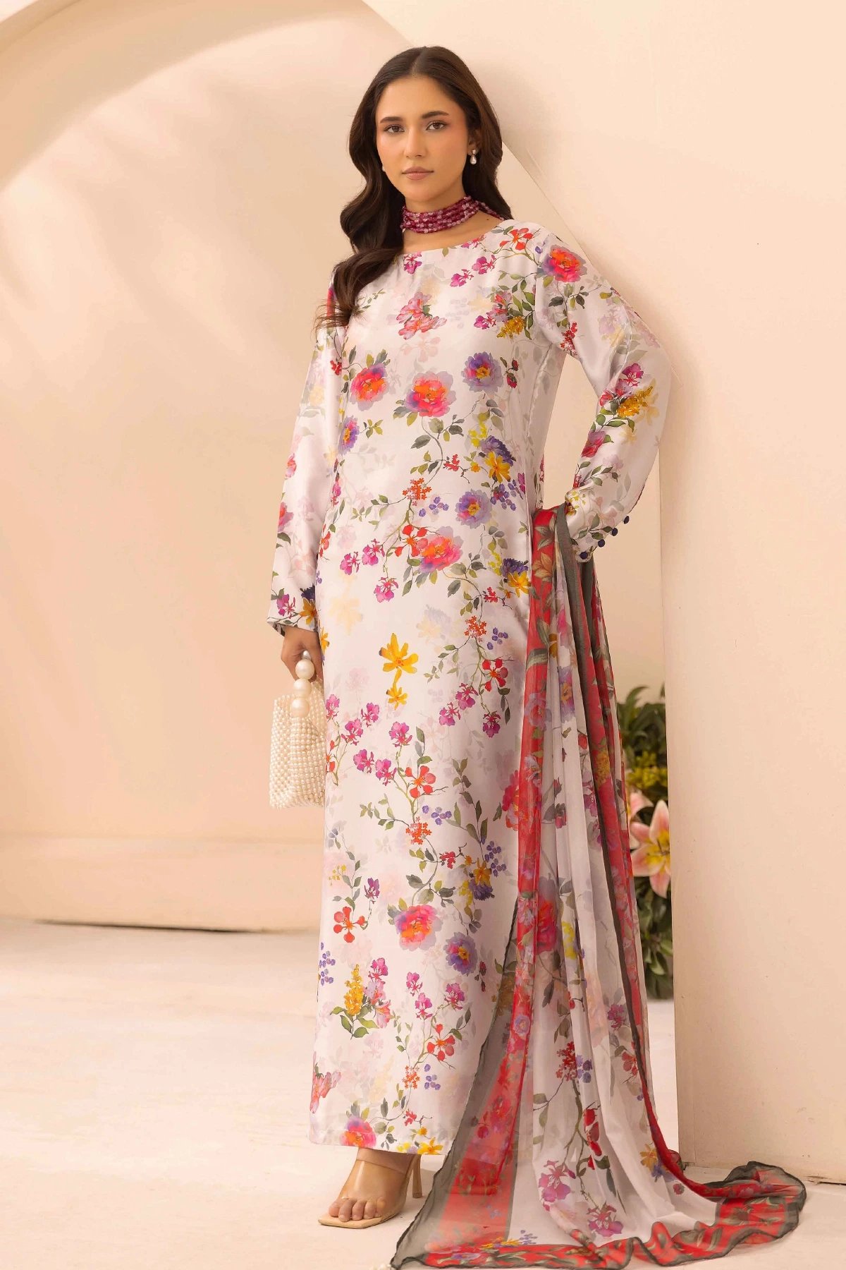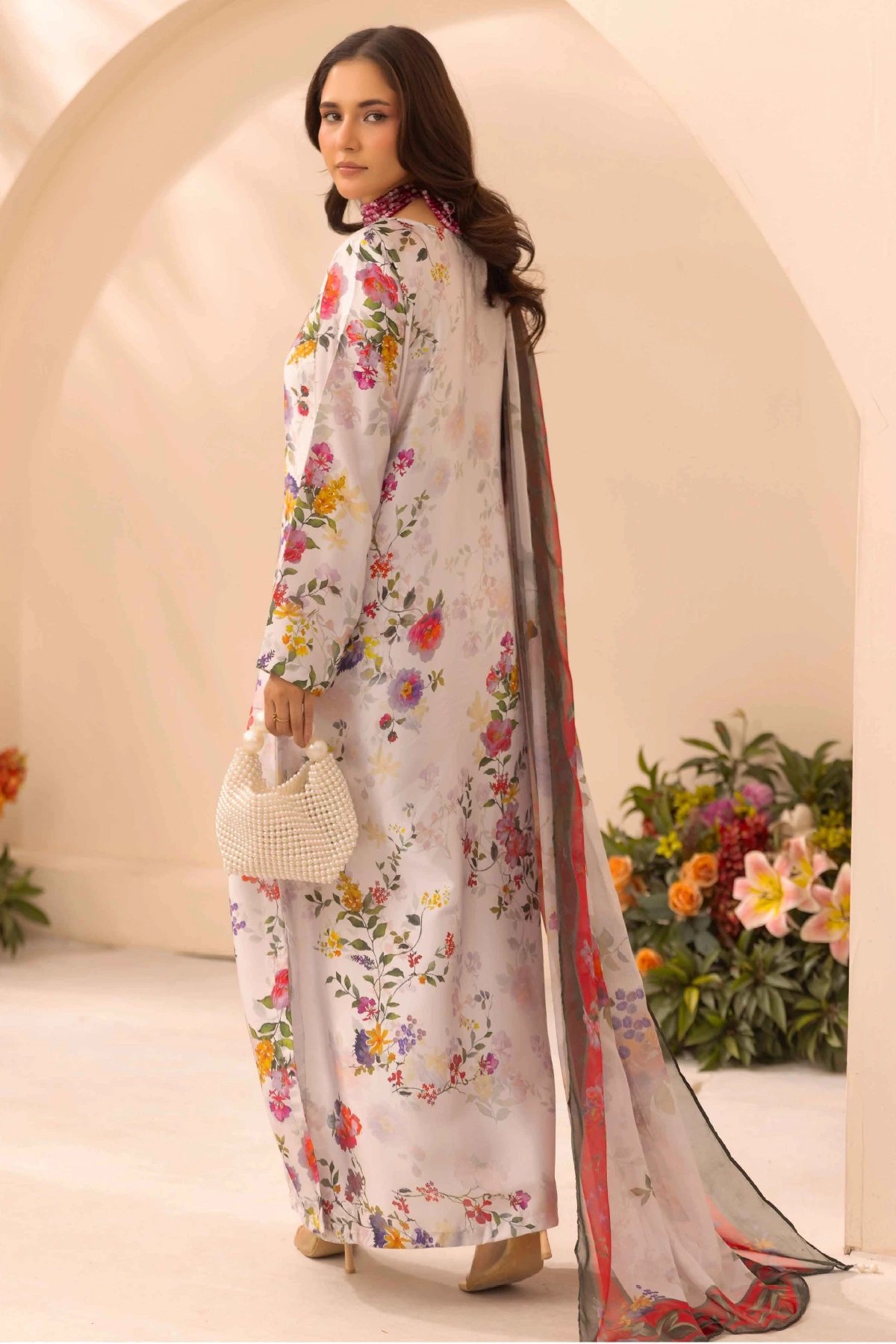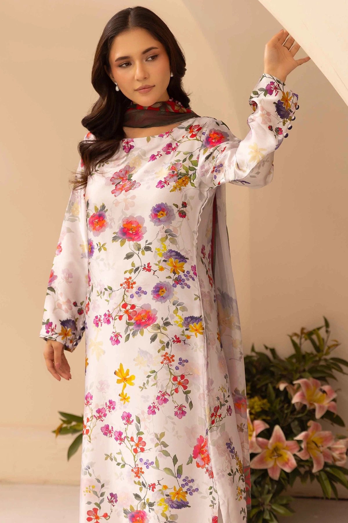 This beautiful 3 piece silk suit exudes soft femininity and timeless charm, featuring a long floral‑printed shirt in delicate pastel tones paired with coordinated trousers for a refined, comfortable fit. The sheer matching chiffon dupatta drapes effortlessly, adding an airy touch that enhances the outfit’s graceful silhouette. Paired with straight leg printed trousers. Perfect mother and daughter collection for this Eid.