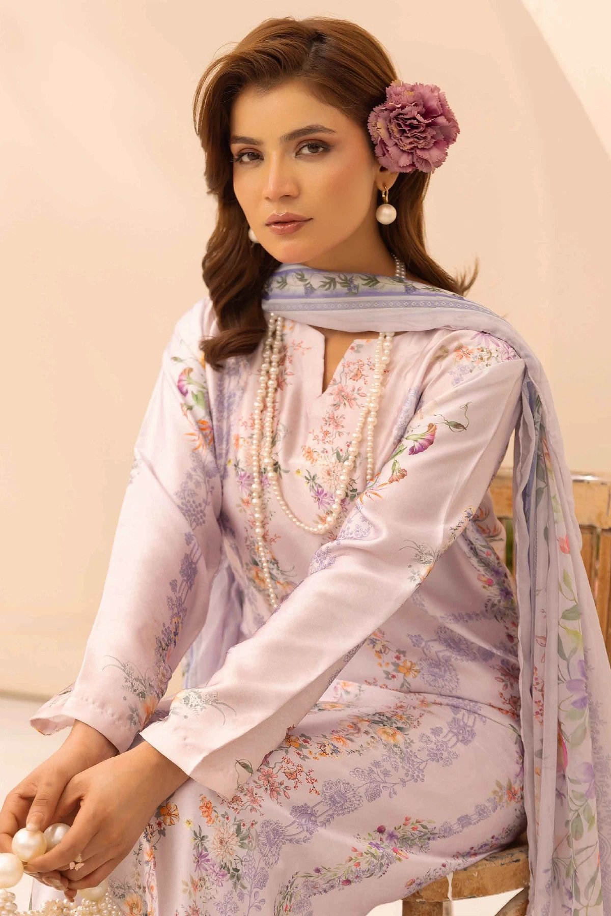 This beautiful 3 piece silk suit exudes soft femininity and timeless charm, featuring a long floral‑printed shirt in delicate pastel tones paired with coordinated trousers for a refined, comfortable fit. The sheer matching chiffon dupatta drapes effortlessly, adding an airy touch that enhances the outfit’s graceful silhouette. Paired with straight leg printed trousers. Perfect mother and daughter collection for this Eid.