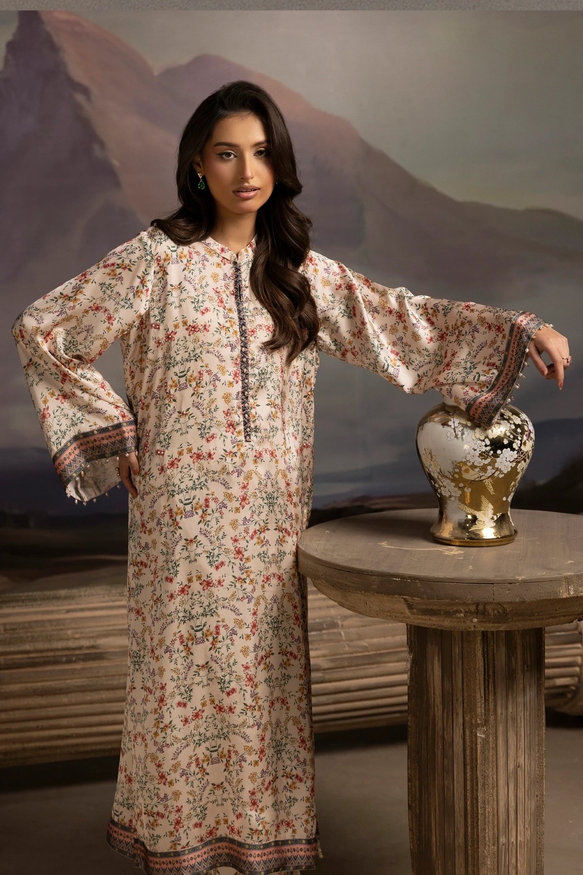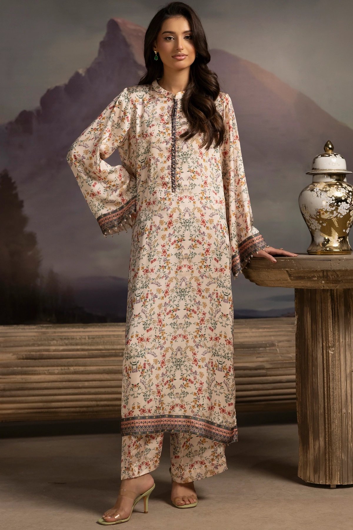 Crafted from premium silk, this soft floral ensemble brings effortless grace to any occasion. The long, flowing shirt features a light base adorned with delicate botanical motifs, creating a fresh, feminine aesthetic. Full sleeves and a beautifully detailed border at the hem add refinement while maintaining a relaxed, airy silhouette. Paired with silk trousers mirror the print for a cohesive, elevated look, offering both comfort and sophistication.