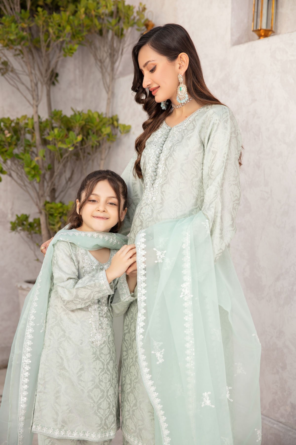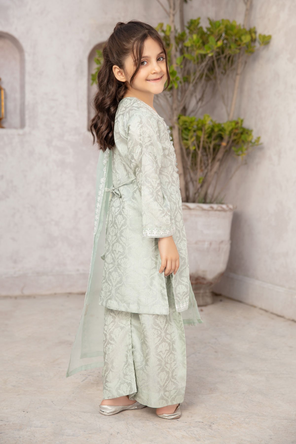 This beautiful kids 3 piece Simonie jacquard collection features a straight printed shirt with thread work embroidered neckline with button embellishments, finished with full length sleeves. It comes with wide leg trousers and the look is finished with an embroidered organza dupatta.