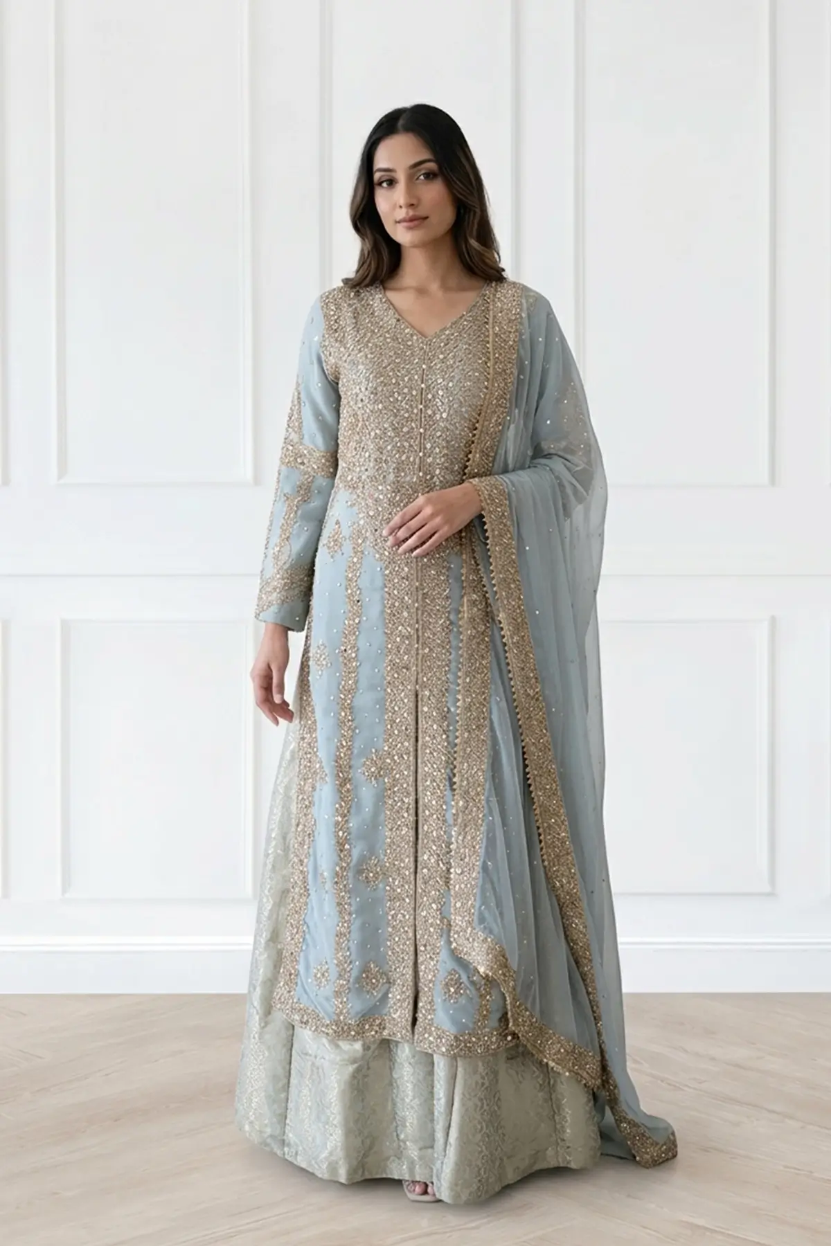 This beautiful 3‑piece chiffon suit is designed with a straight, beautifully crafted shirt featuring a refined center slit that adds length and structure to the silhouette. The shirt is adorned with intricate thread work and delicately scattered diamantes that catch the light softly, giving the outfit a graceful, festive shimmer. The detailing is thoughtfully placed along the neckline, front panel, sleeves, and borders, creating a polished and cohesive look. Paired with a luxurious banarsi lehnga, the ensemble gains richness and traditional charm — the lehnga showcases classic woven patterns and a structured flare that moves beautifully. Completing the outfit is an embroidered chiffon dupatta, finished with ornate borders and delicate motifs that elevate the entire look with a soft, elegant drape.