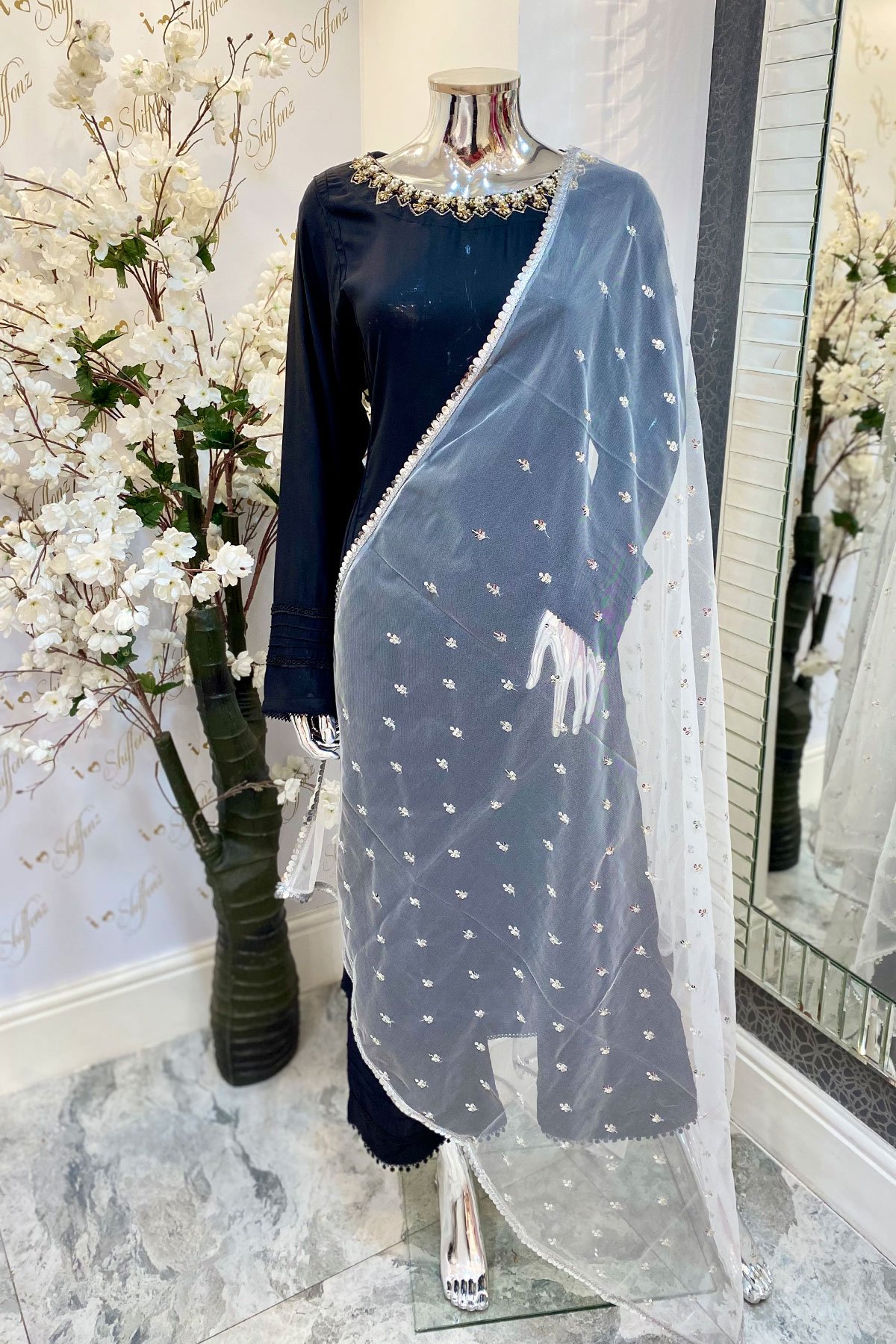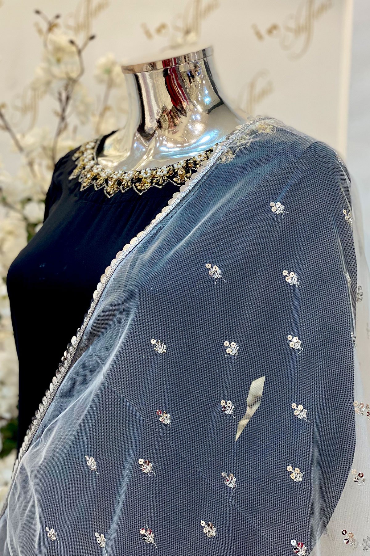 Add a touch of elegance to your wardrobe with this exquisite piece of splendid soft net dupatta. Swathed with embroidery and delicate sequins work, finished with silver lace and coin tassels around the borders, this versatile stunner is a must in your collection.