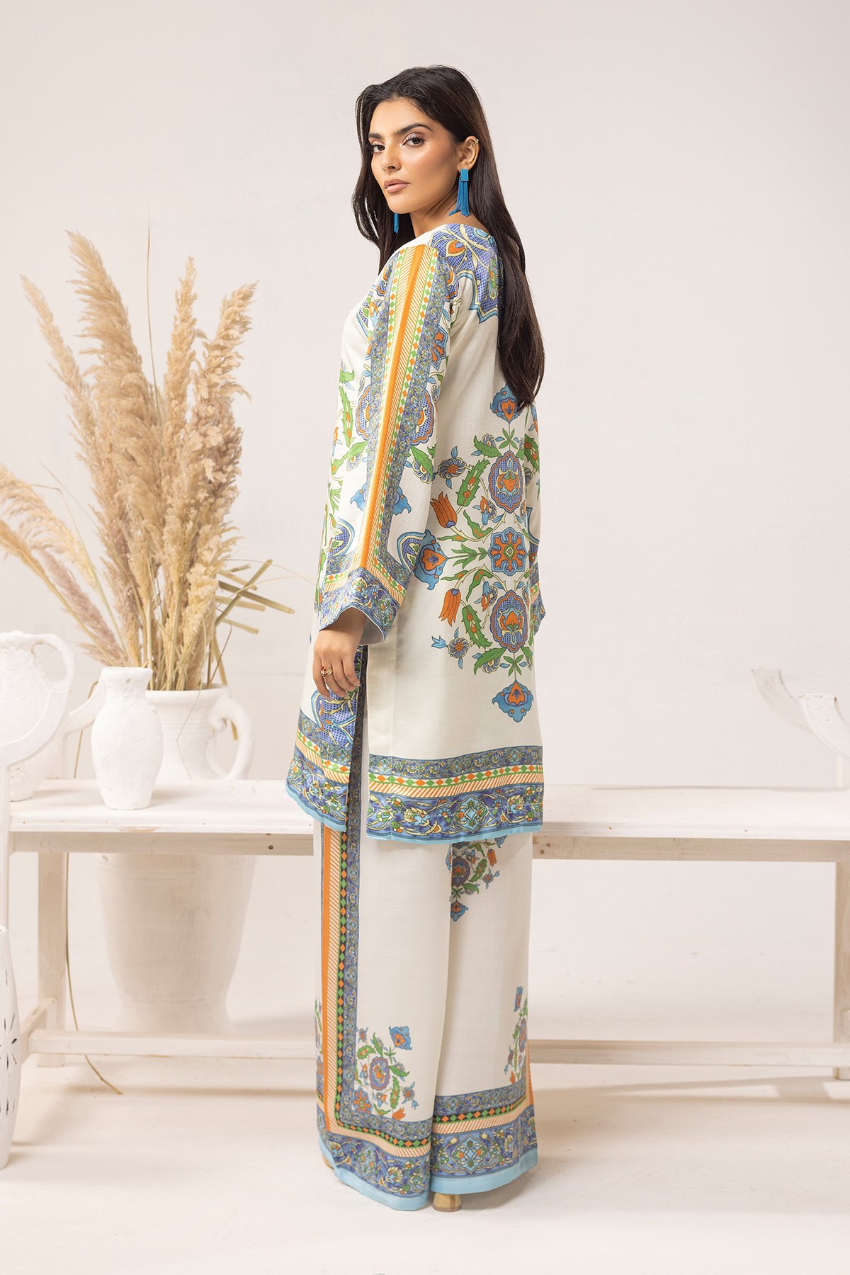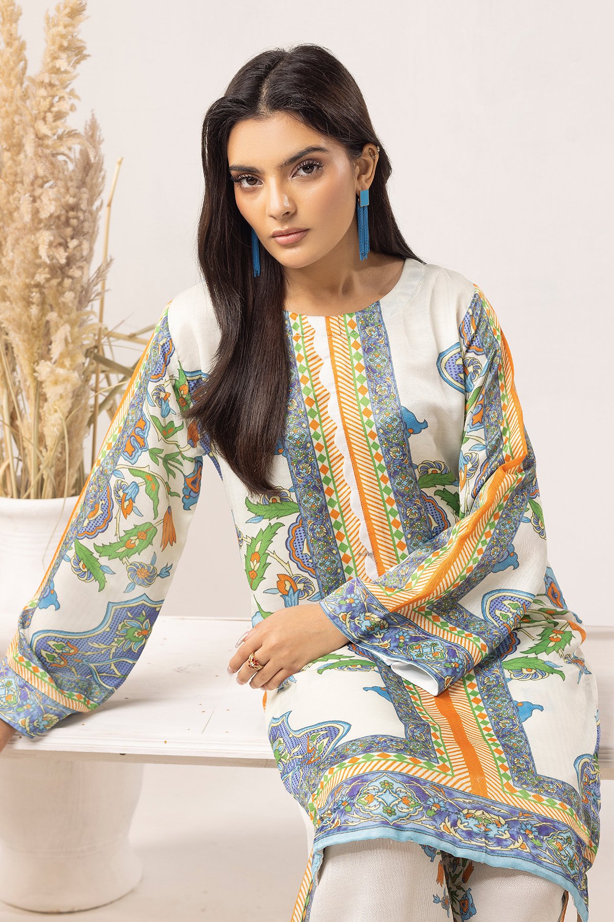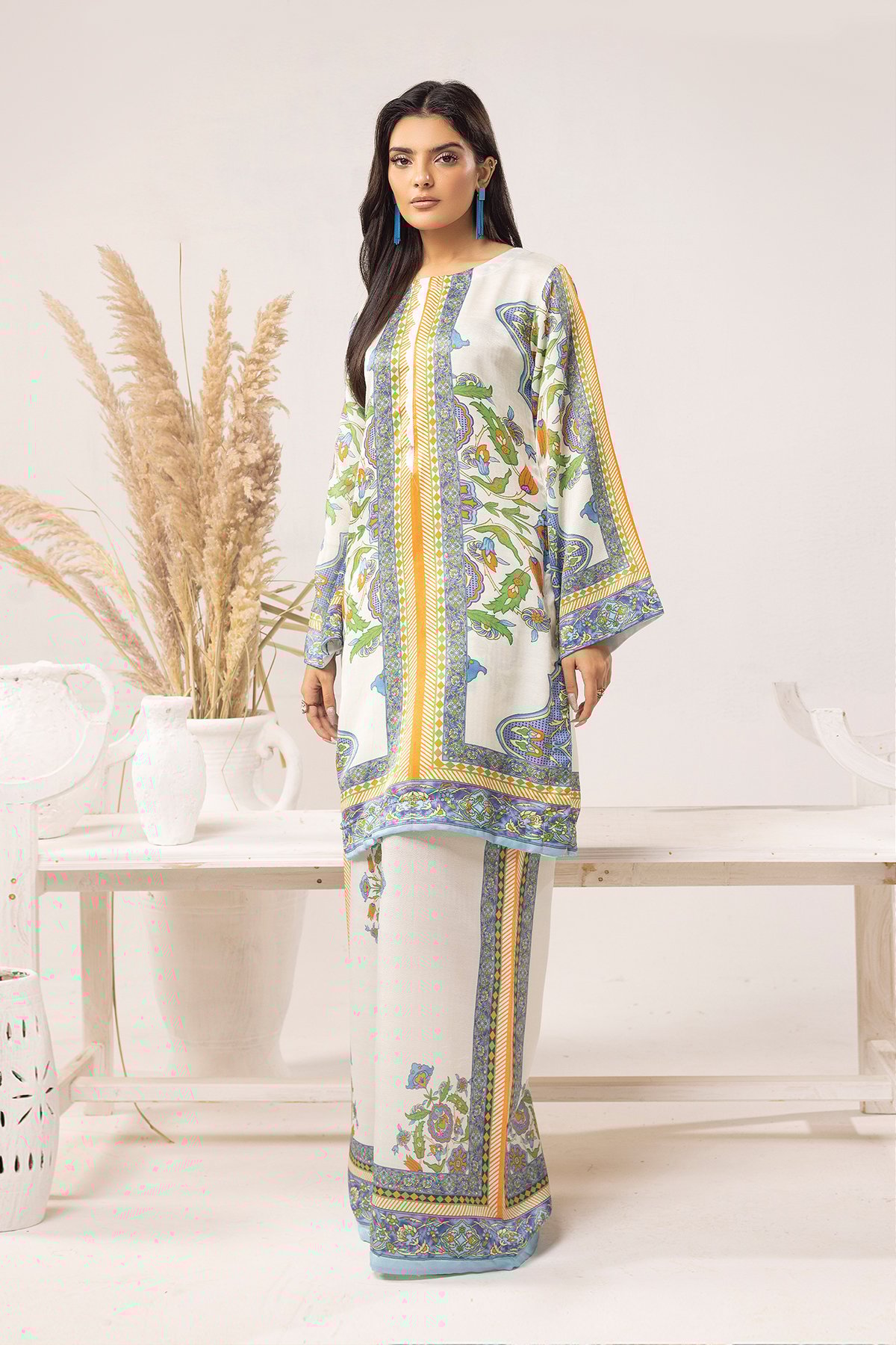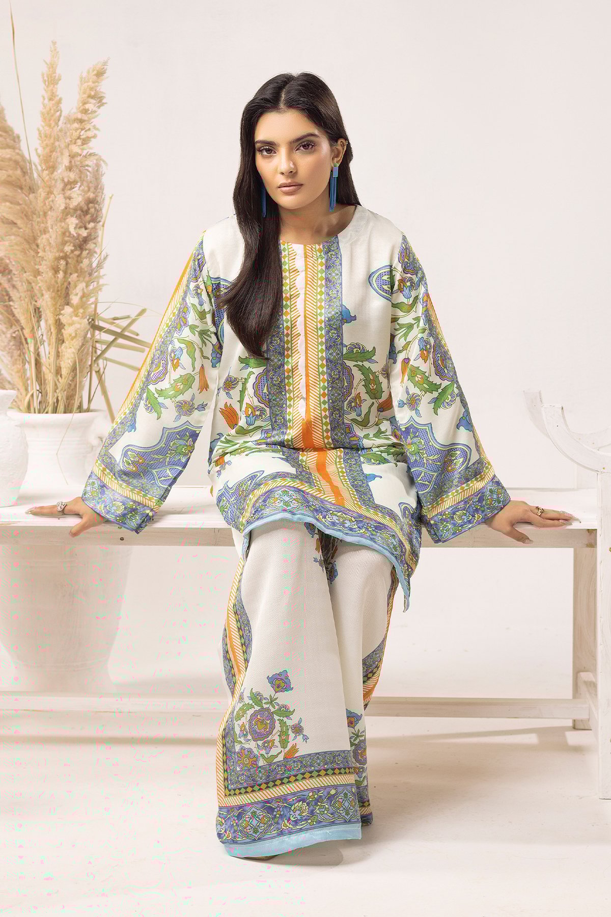 Add elegance to your wardrobe this season with exotic designs. Get the cozy chic vibe in our acrylic wool co-ord set featuring a straight printed shirt with full length sleeves. Paired with flared printed trousers.