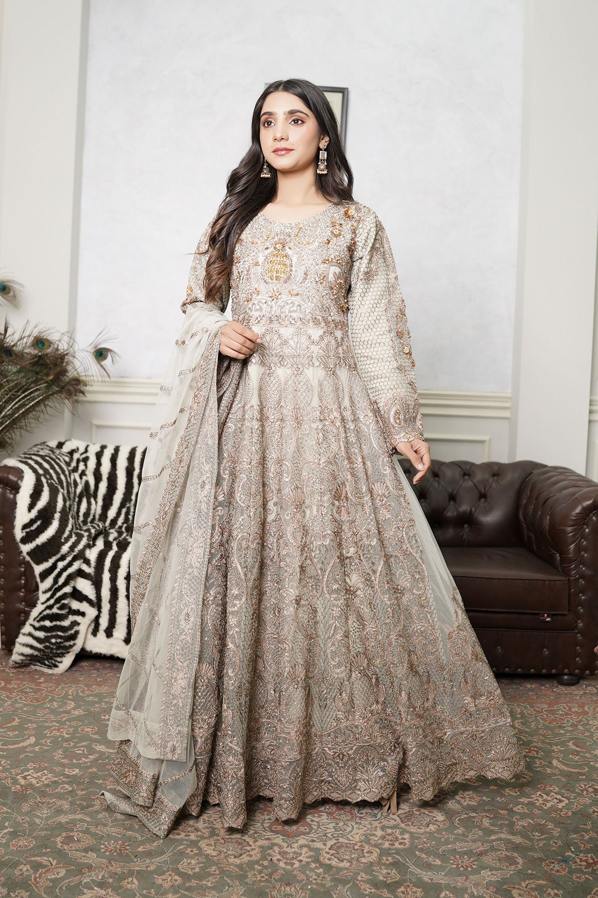 This beautiful 3 piece Tara collection features a long peplum gown with luxury thread work embroidery with tilla embellishments in between finished with bead embellishment throughout on the net overlay. It comes with full length embroidered sleeves and straight leg crepe trousers. The look is finished with a net embroidered dupatta.