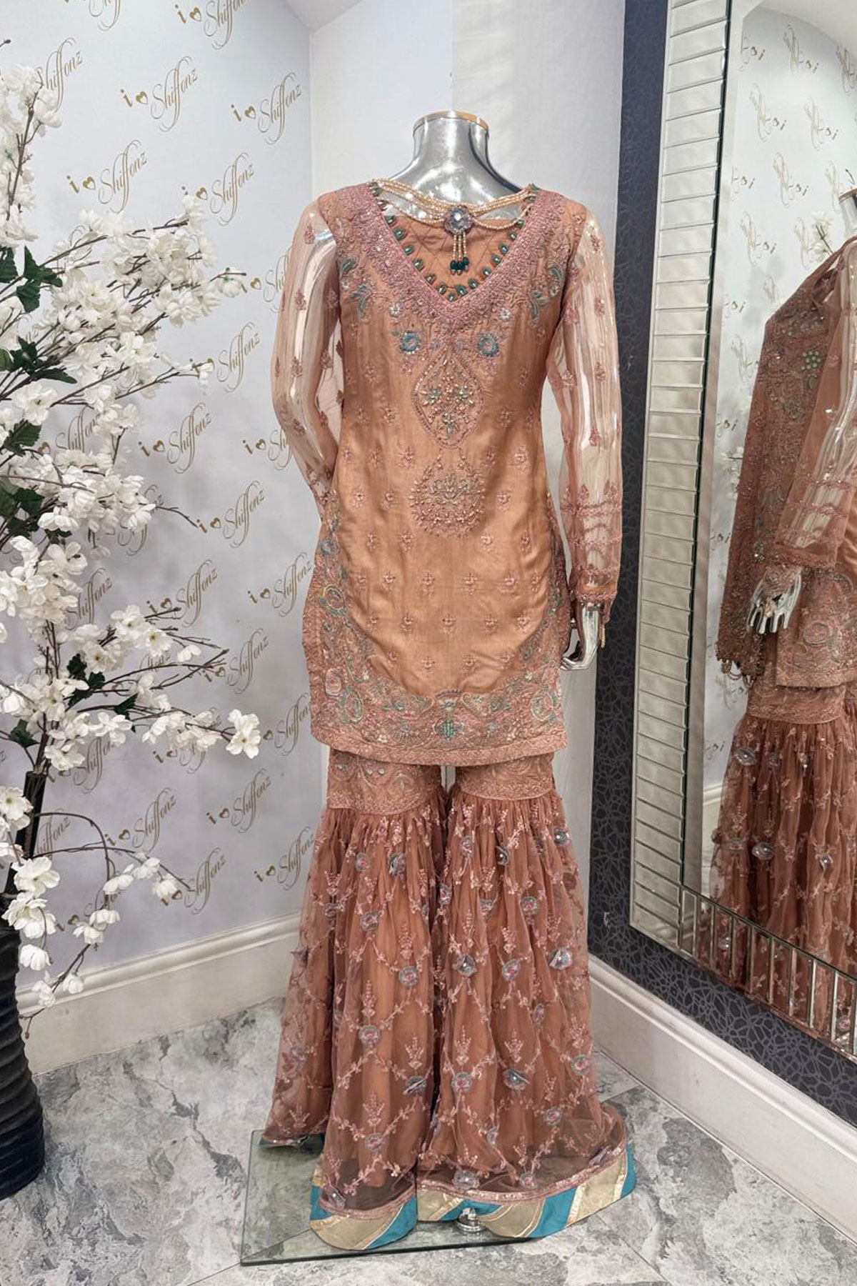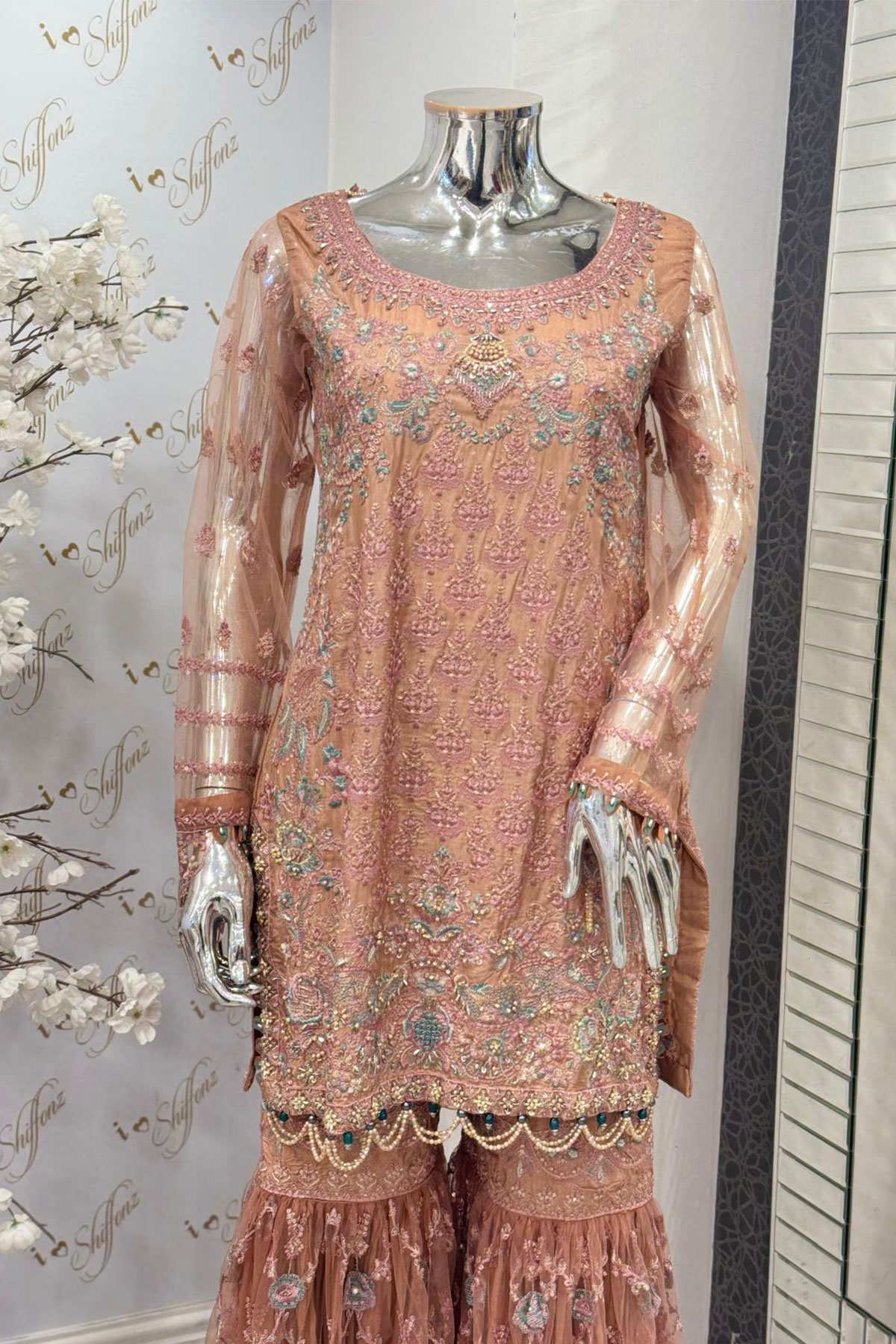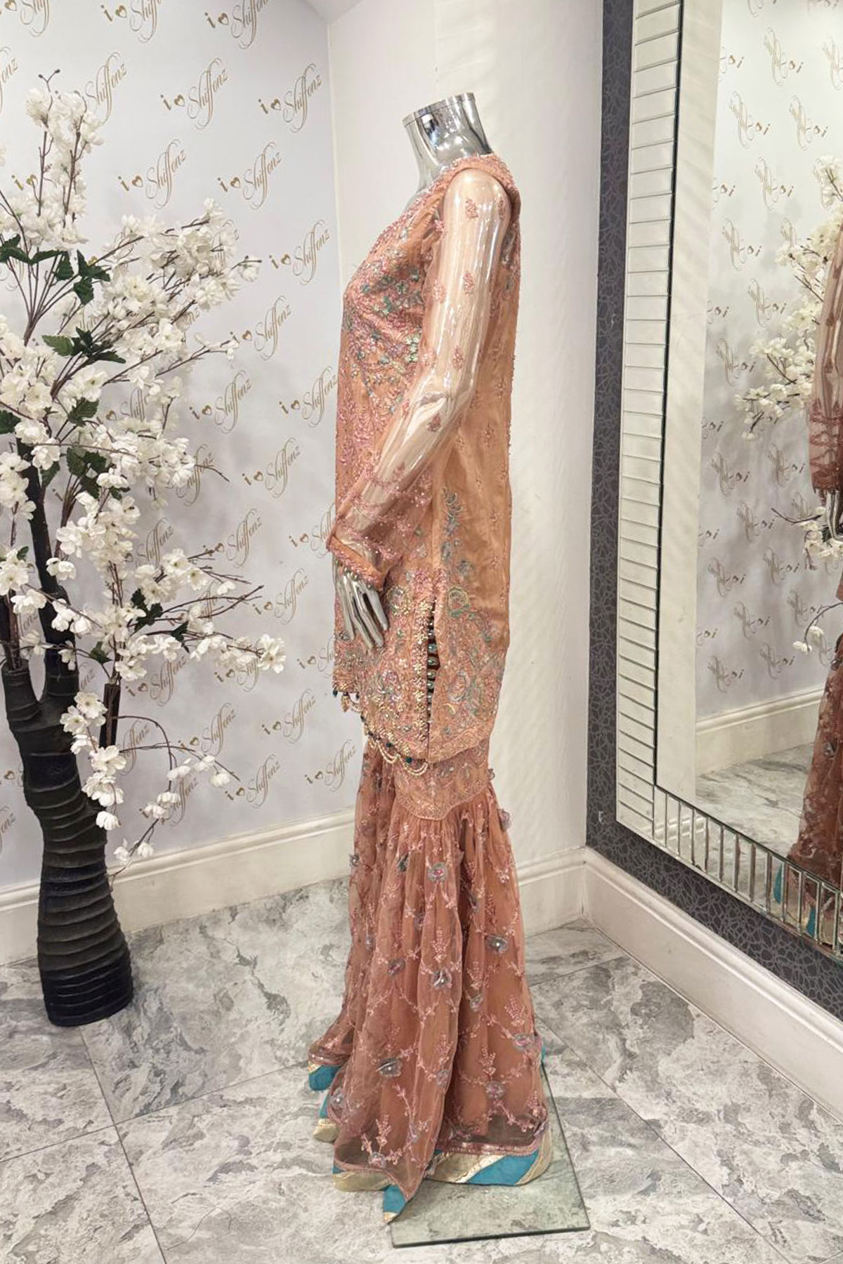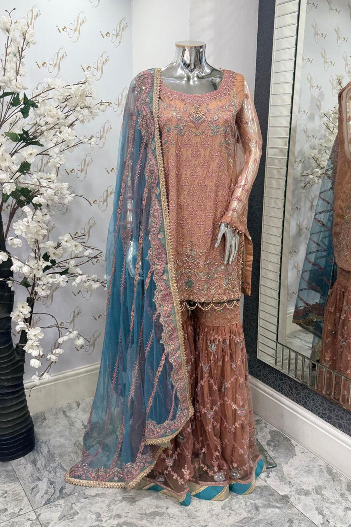 This beautiful 3 piece suit features a straight shirt with luxury thread work embroidery throughout with sequins and bead embellishments, finished with dangling beaded tassels on the border along with a detailed beaded embellishment on the back. It comes with see through embroidered full length sleeves. Paired with an embroidered gharara and the look is finished with a contrasted embroidered dupatta.