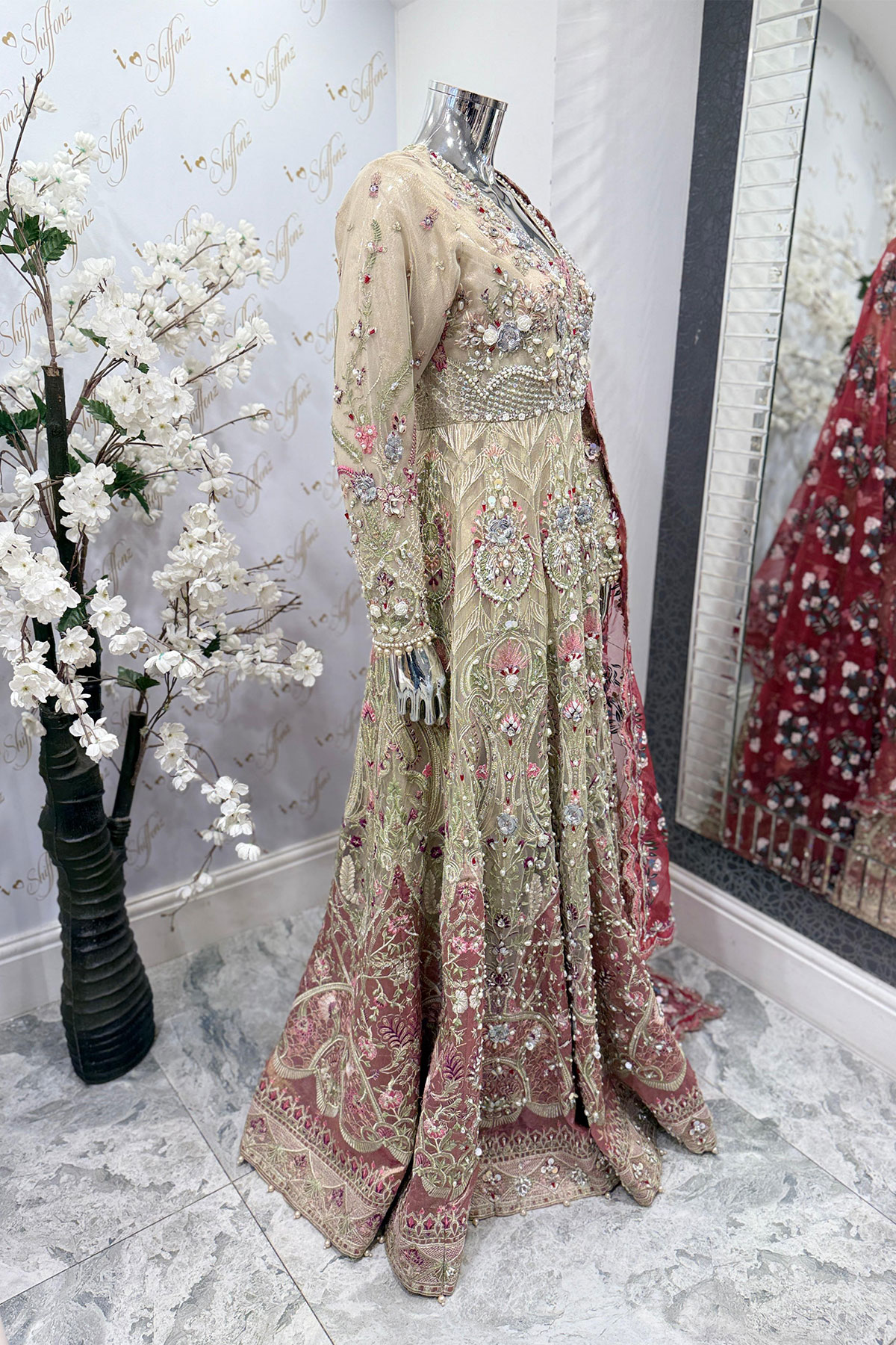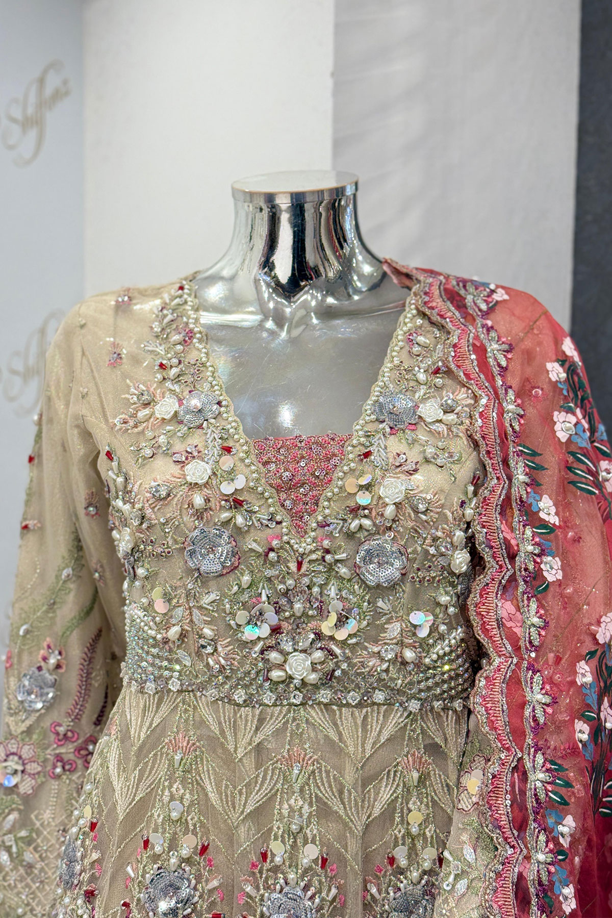 This beautiful 3 piece gown features luxury thread work embroidery with bead motifs and pearl embellishments throughout with v-neckline, finished with a tie dye border. It comes with full length embroidered sleeves, Paired with straight leg raw silk trousers and the look is finished with a contrasted organza printed dupatta.