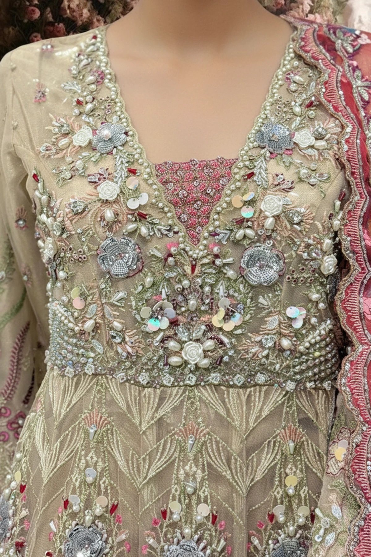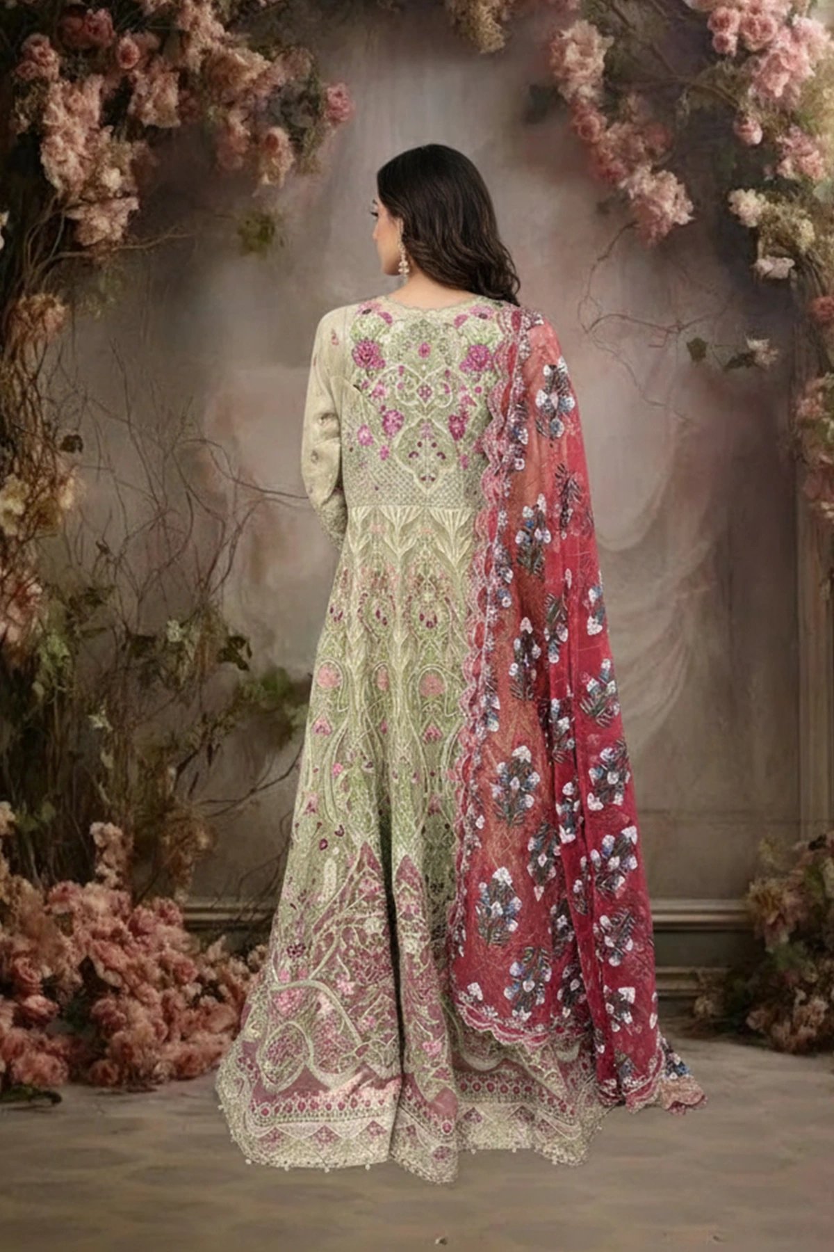 This beautiful 3 piece gown features luxury thread work embroidery with bead motifs and pearl embellishments throughout with v-neckline, finished with a tie dye border. It comes with full length embroidered sleeves, Paired with straight leg raw silk trousers and the look is finished with a contrasted organza printed dupatta.