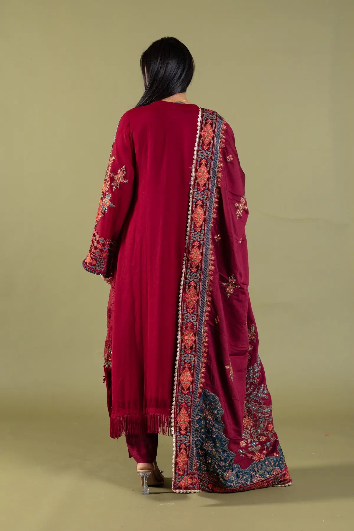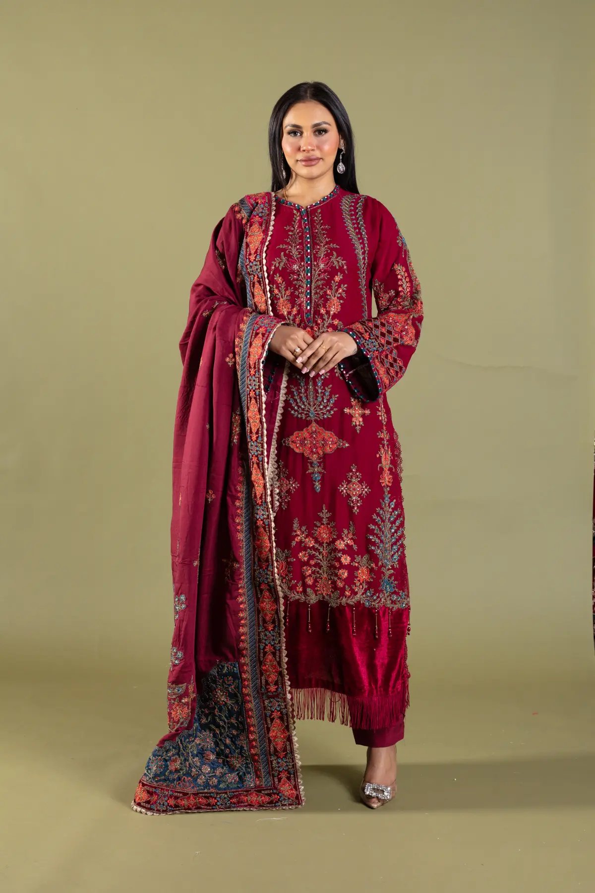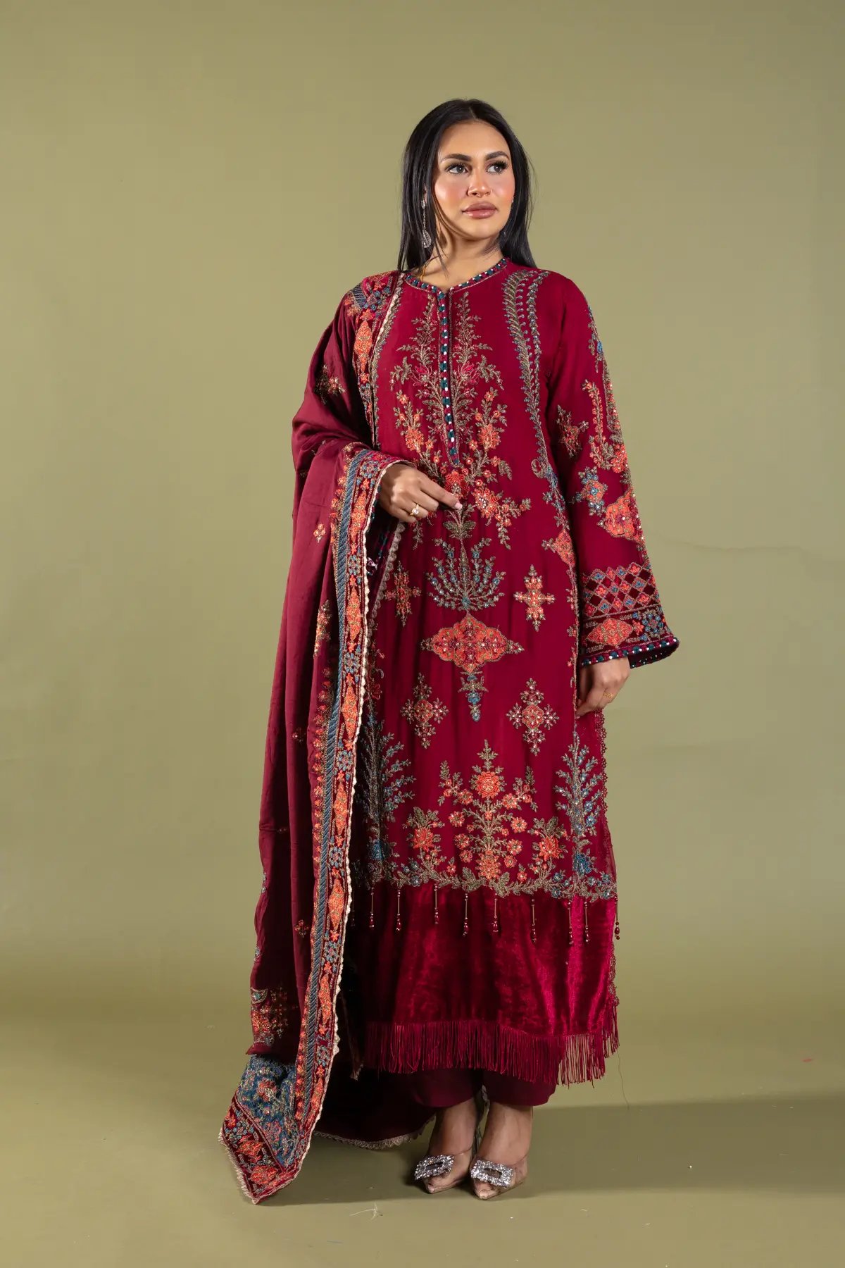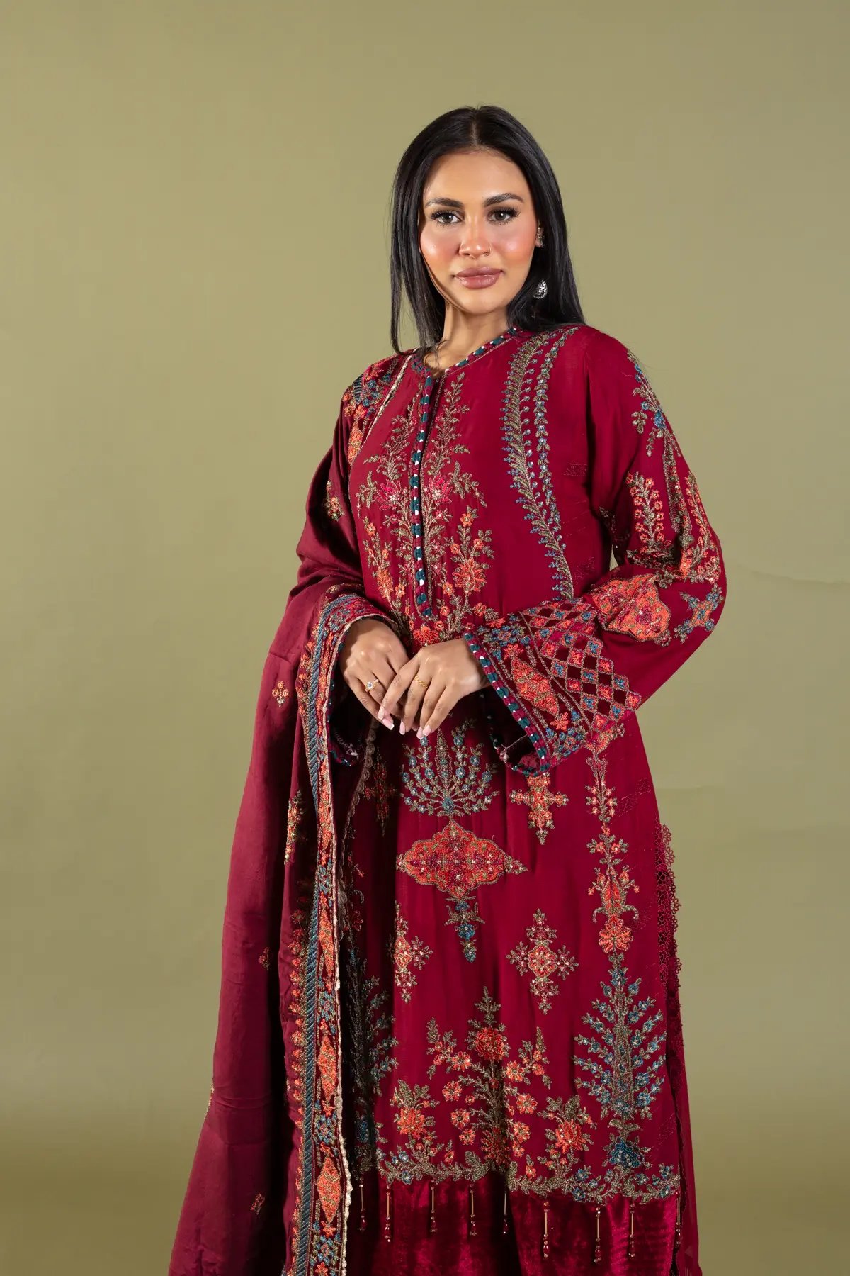 This beautiful 3 piece Maria b inspired suit features a straight shirt with luxury thread work embroidery throughout with motif and bead embellishments finished with velvet bordered with dangling tassels, finished with full length embroidered sleeves. Paired with straight leg trousers. The look is finished with a heavy embroidered dupatta. Perfect festive collection for this Eid and wedding season.
