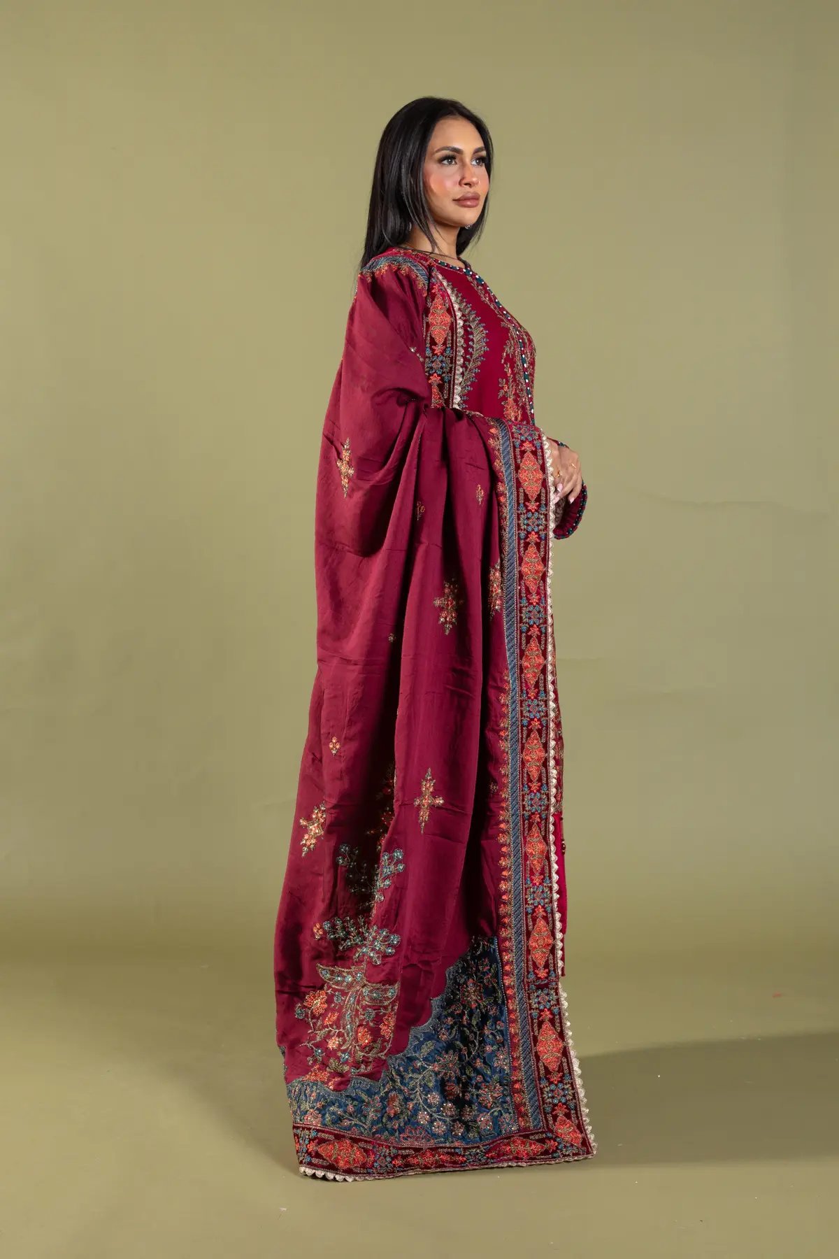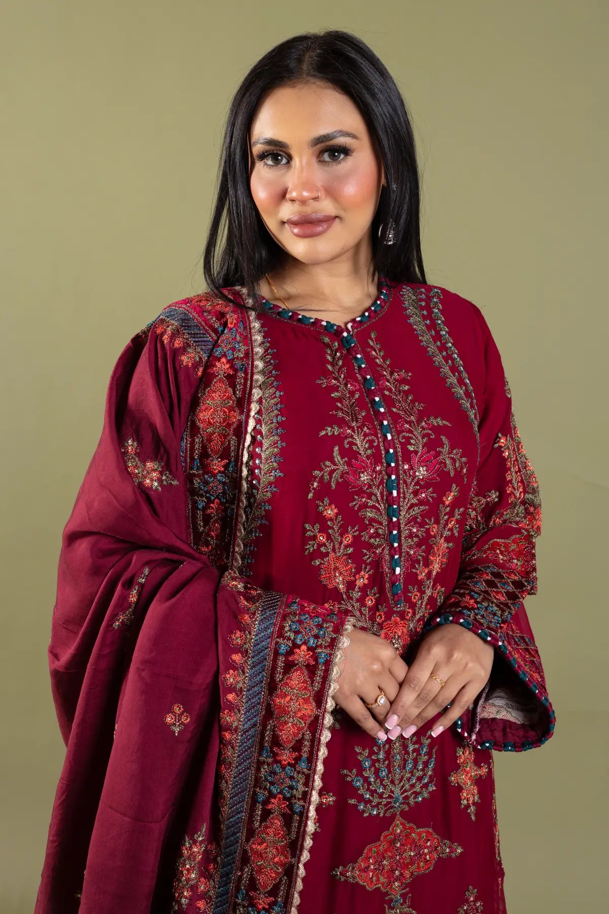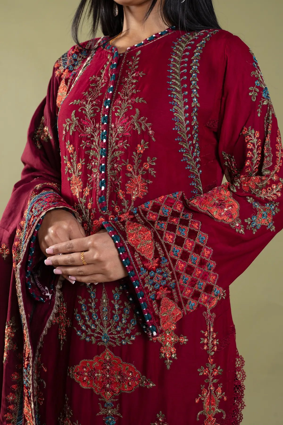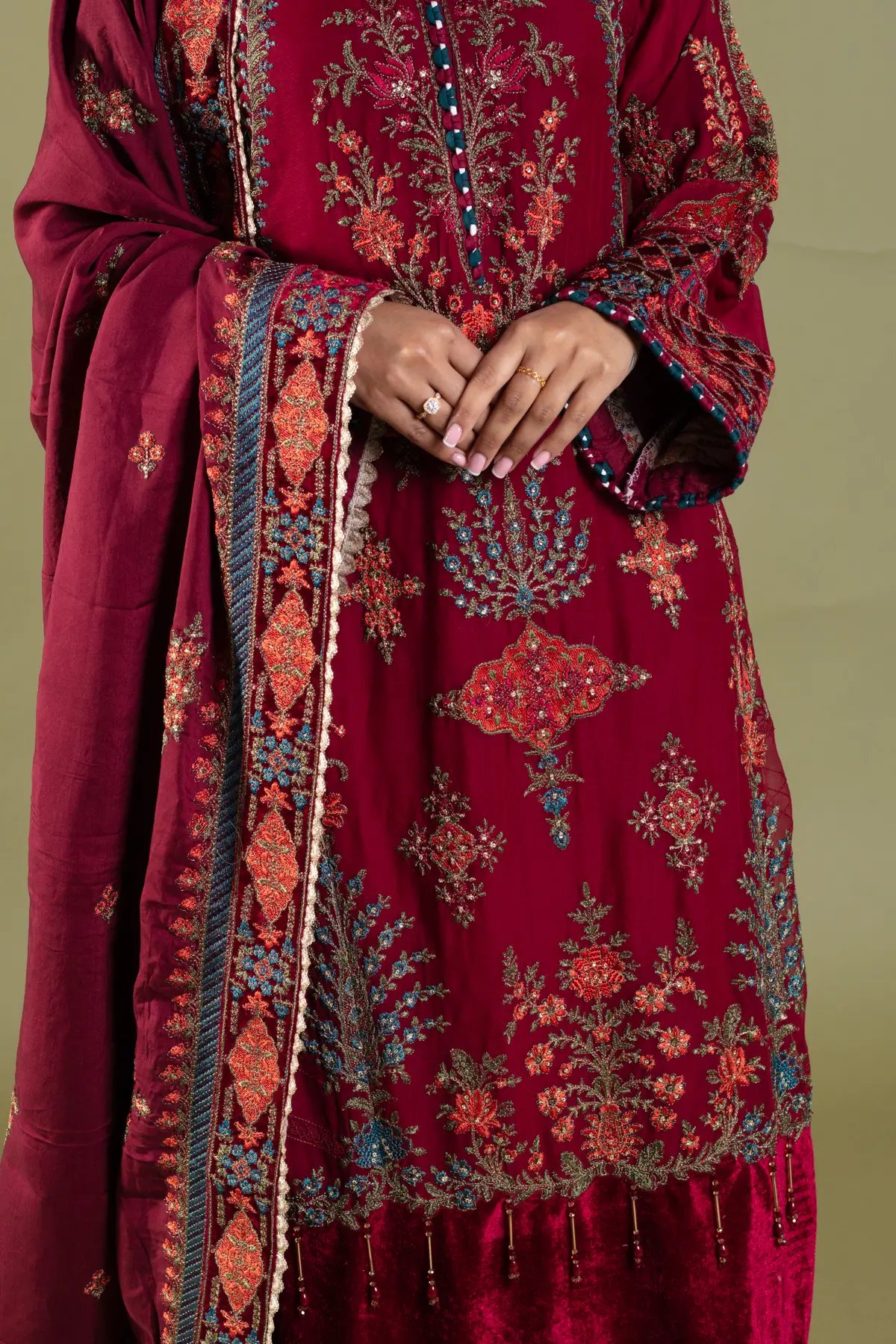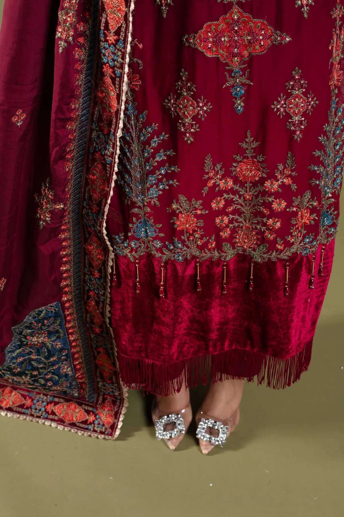 This beautiful 3 piece Maria b inspired suit features a straight shirt with luxury thread work embroidery throughout with motif and bead embellishments finished with velvet bordered with dangling tassels, finished with full length embroidered sleeves. Paired with straight leg trousers. The look is finished with a heavy embroidered dupatta. Perfect festive collection for this Eid and wedding season.
