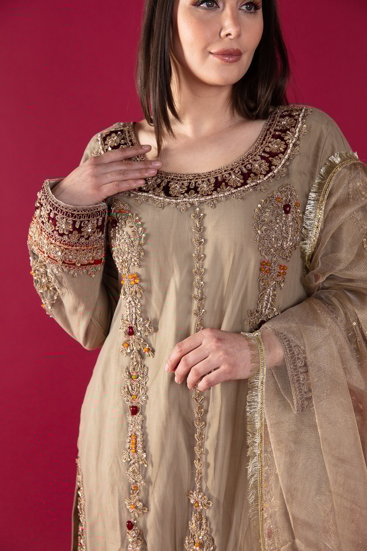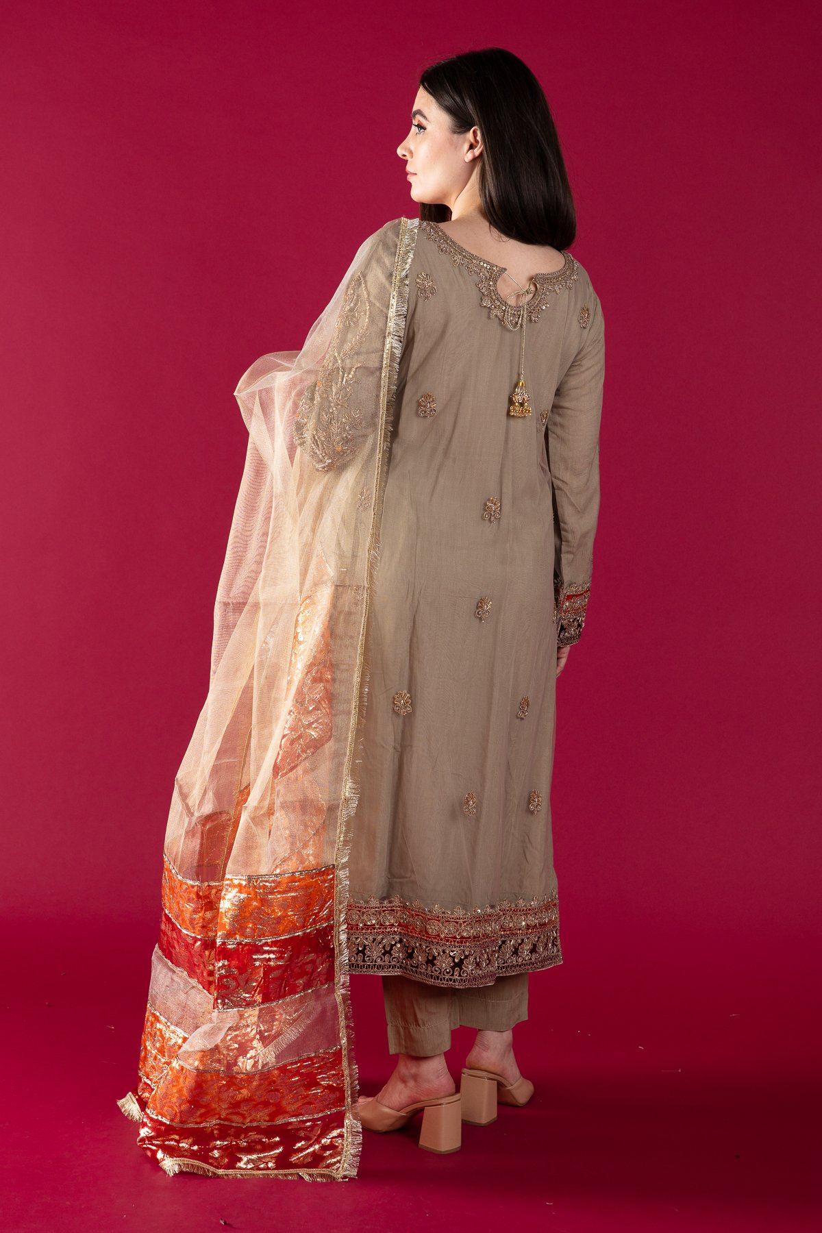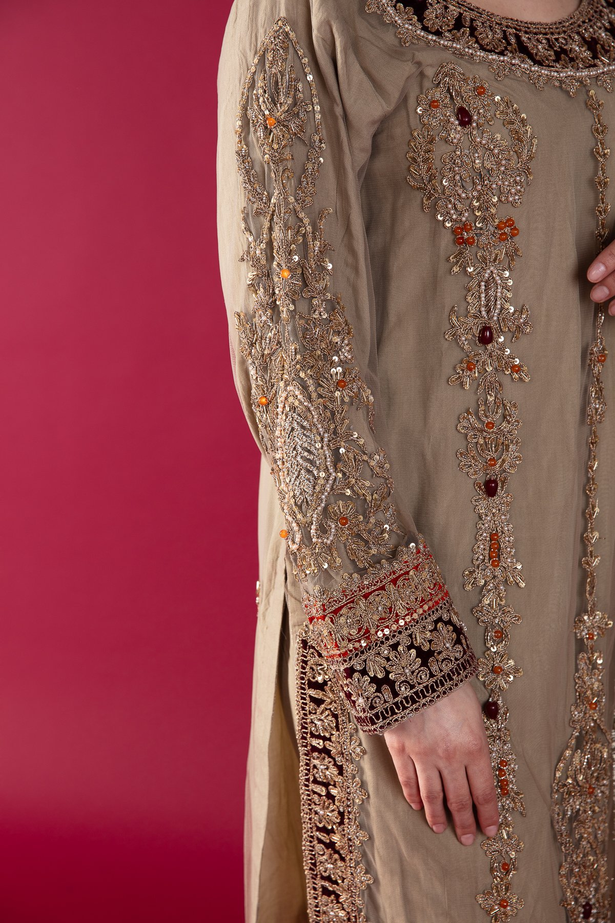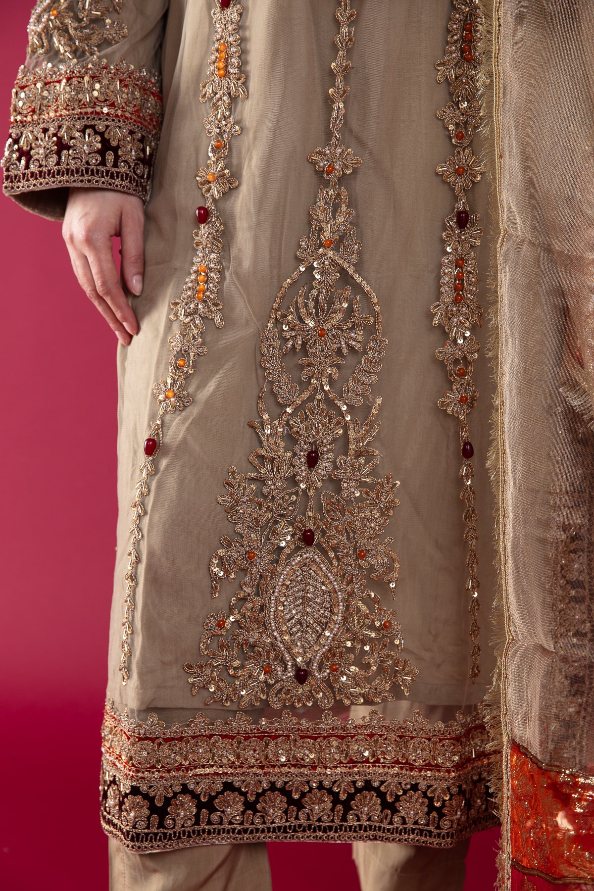This beautiful 3 piece net suit features a straight shirt with luxury thread work embroidery throughout with sequence and bead motif embellishment, finished with full length embroidered sleeves. It comes with straight leg crepe trousers and the look is finished with an organza dupatta.