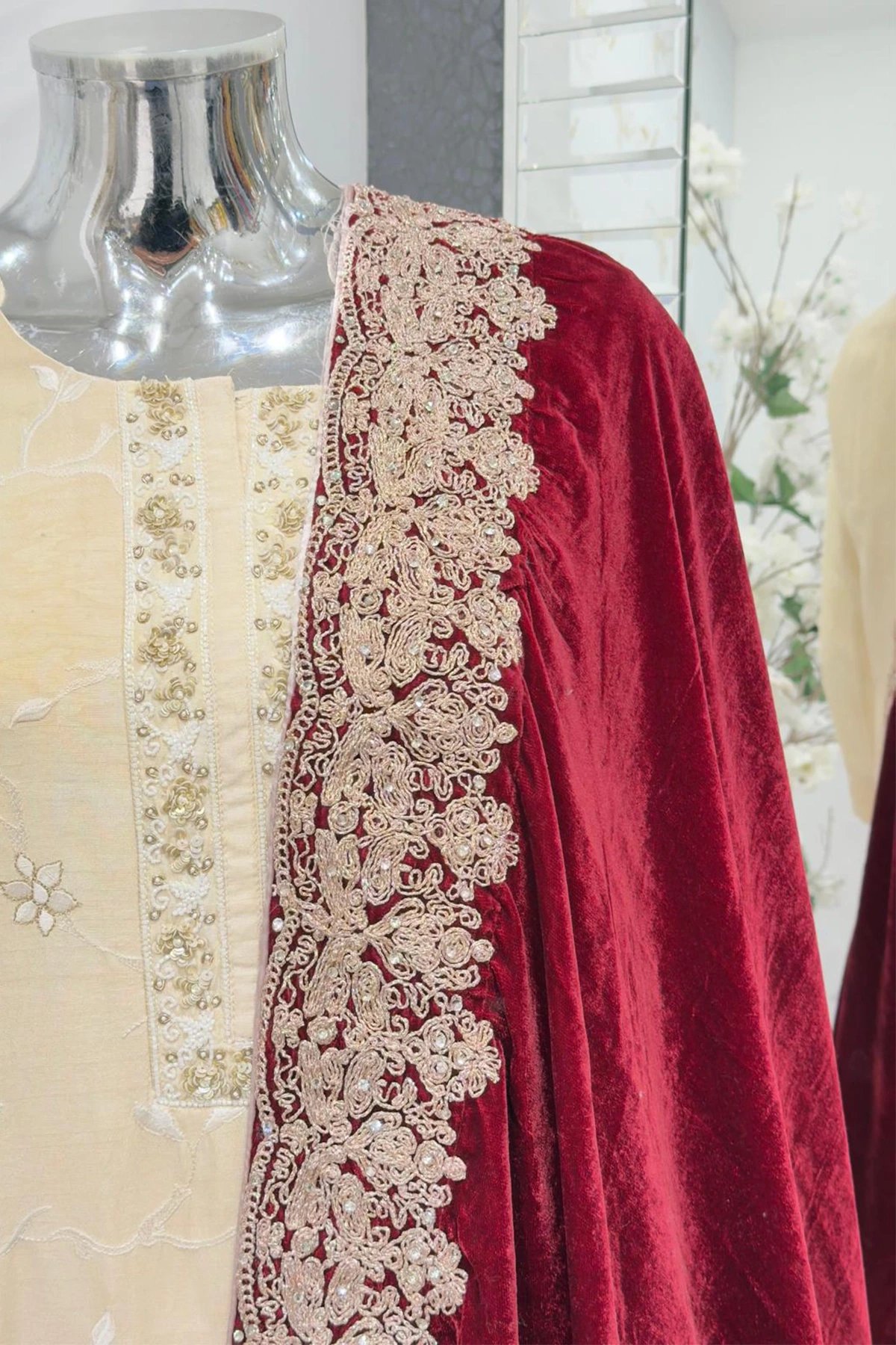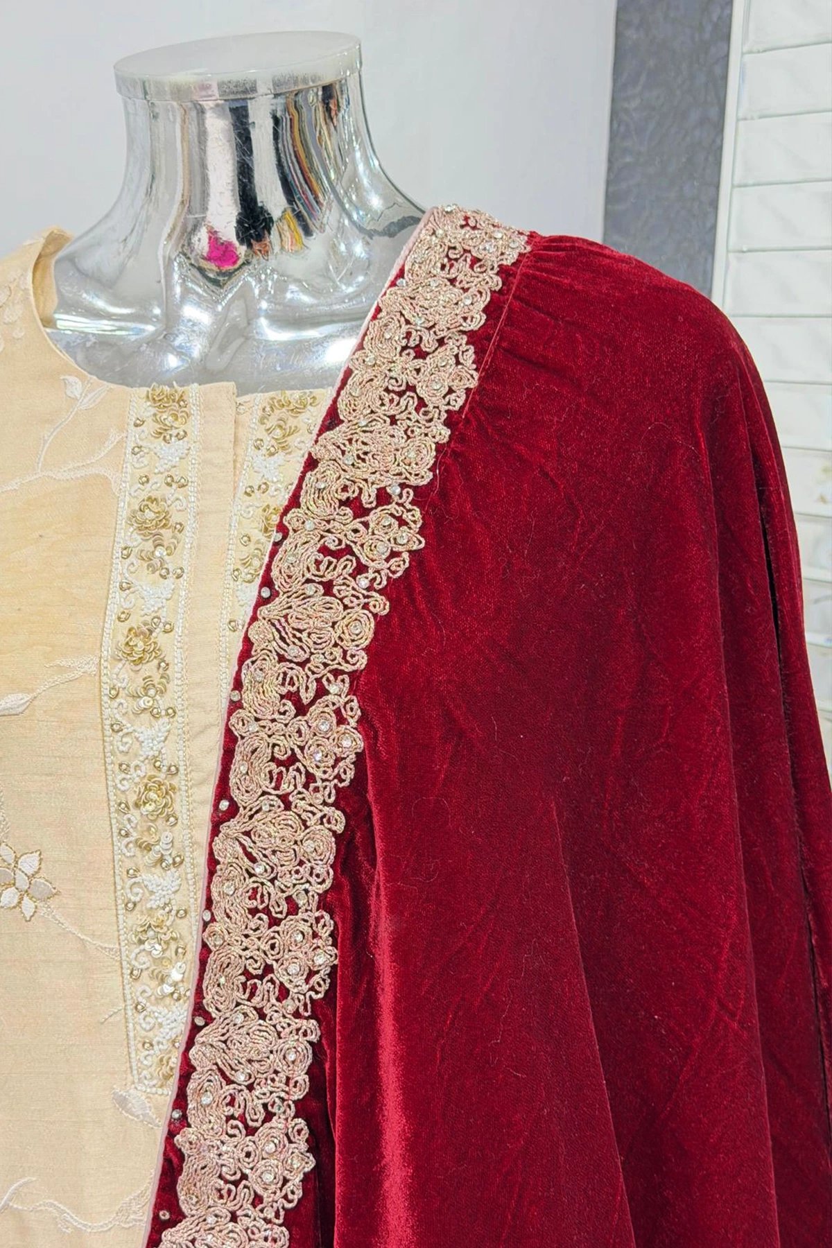 Add a touch of elegance to your winter hues wardrobe with this exquisite piece of beautifully dori work embroidery on the borders of velvet shawl swathed with diamantés. Both sided border are of different sizes as shown in pictures. This classic stunner is a must in your winter collection.