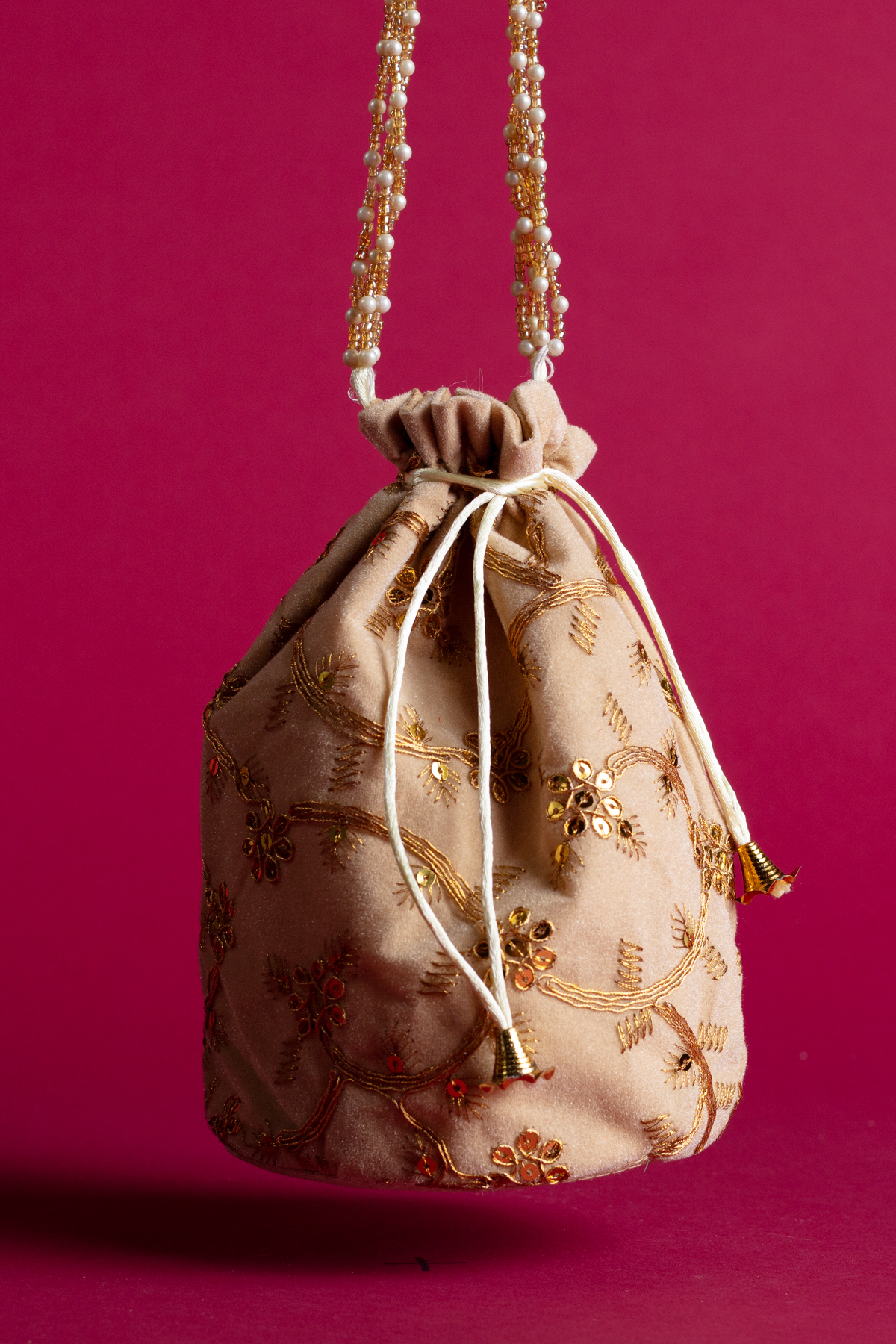 Luxury potli bag is embellished with high-quality thread work and sequence embellishments throughout the front and back with beautiful colour combinations on a high quality velvet fabric. Motif drawstrings along the wrist handle studded with pearls and beads. Potli bags are irreplaceable fashion accessories that women love to flaunt. very unique, these bags are perfect accessories for casual and party wear attires.