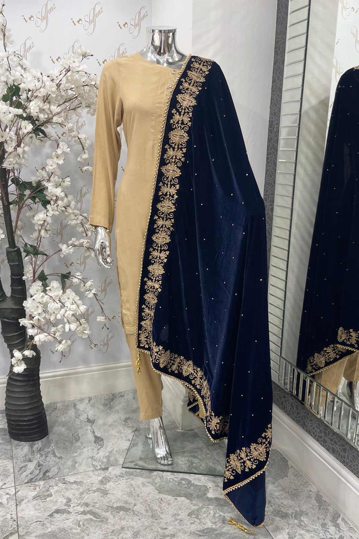 Add a touch of elegance to your winter hues wardrobe with this exquisite piece of beautifully thread work embroidered velvet shawl. Swathed with diamanté’s throughout, this classic stunner is a must in your winter collection. Note: These shawls do not have latkans at the borders and embroidery can vary in gold and silver beads.