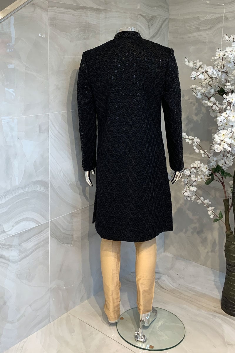 This beautiful men’s velvet sherwani features a long coat all closed upto the collar and below the knee lengthwise. It is designed with beautiful thread-work embroidered detailing all over the front and full length sleeves with shiny scattered diamanté’s. Note: The trousers shown in the pictures are not included.