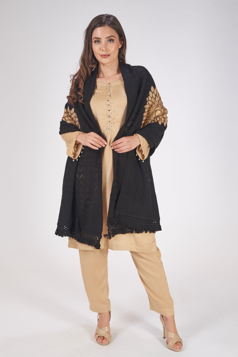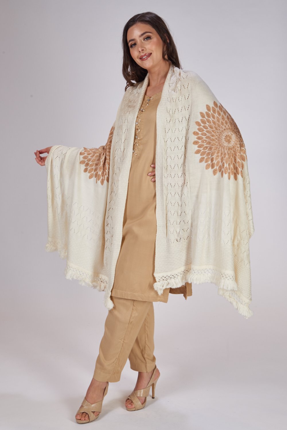 Add a touch of elegance to your winter hues wardrobe with this exquisite piece crafted from lightweight wool material designed to be worn around the shoulders or draped as a shawl or wrap often used in more formal settings or as a decorative piece, Adorned with intricate floral weaving in the middle, They’re known for its warmth and versatility, offering a stylish and practical way to add texture and warmth to an outfit.