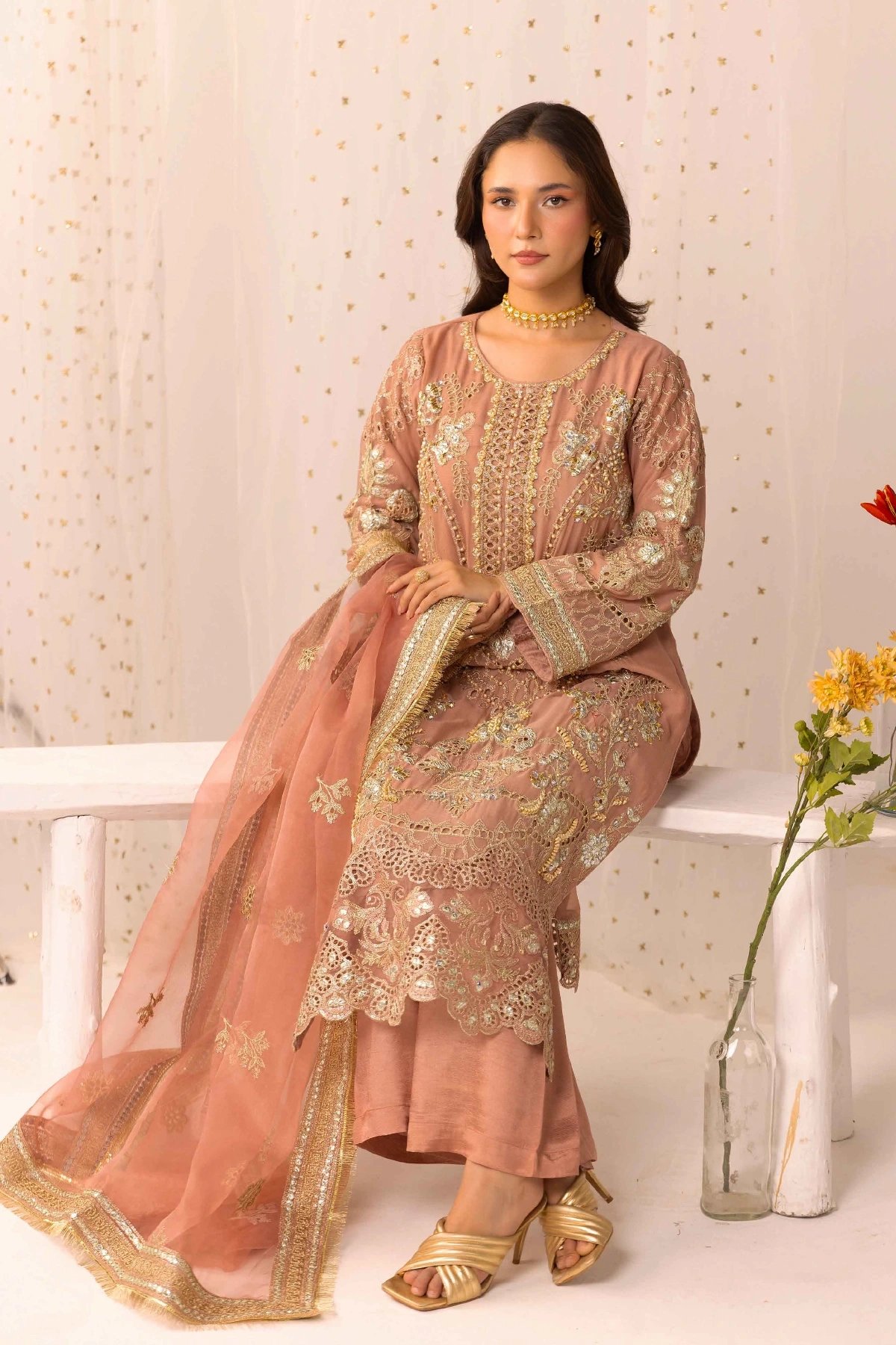 This beautiful 3 piece Yamna collection features a straight shirt with luxury thread work embroidery throughout with sequence embellishment, finished with full length embroidered sleeves. Paired with straight leg crepe trousers. The look is finished with an embroidered organza dupatta. Perfect mother and daughter collection for this Eid.