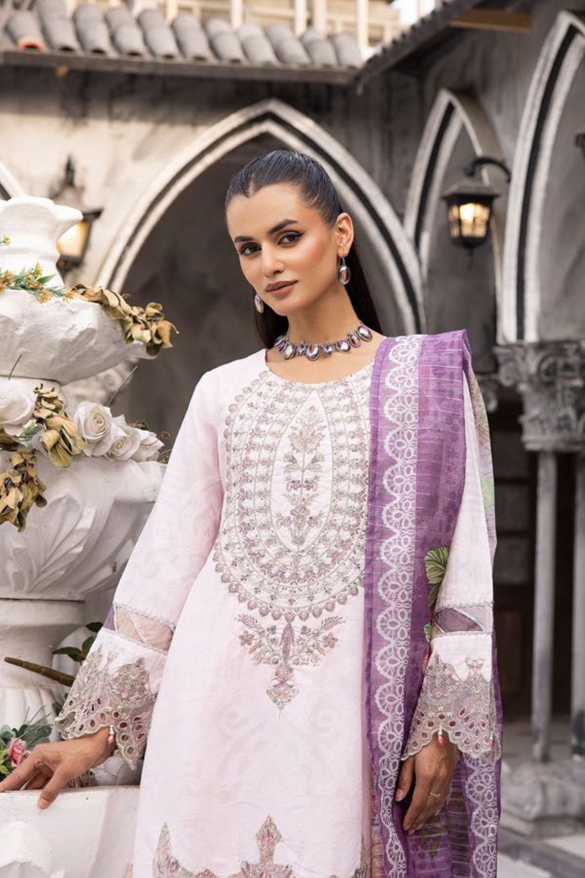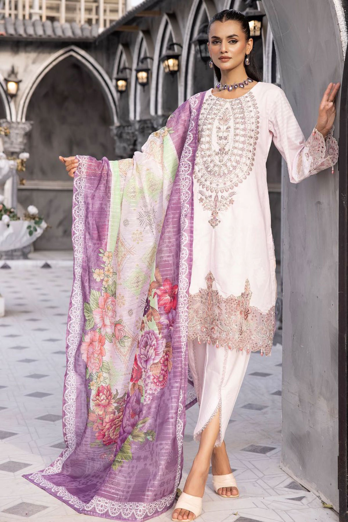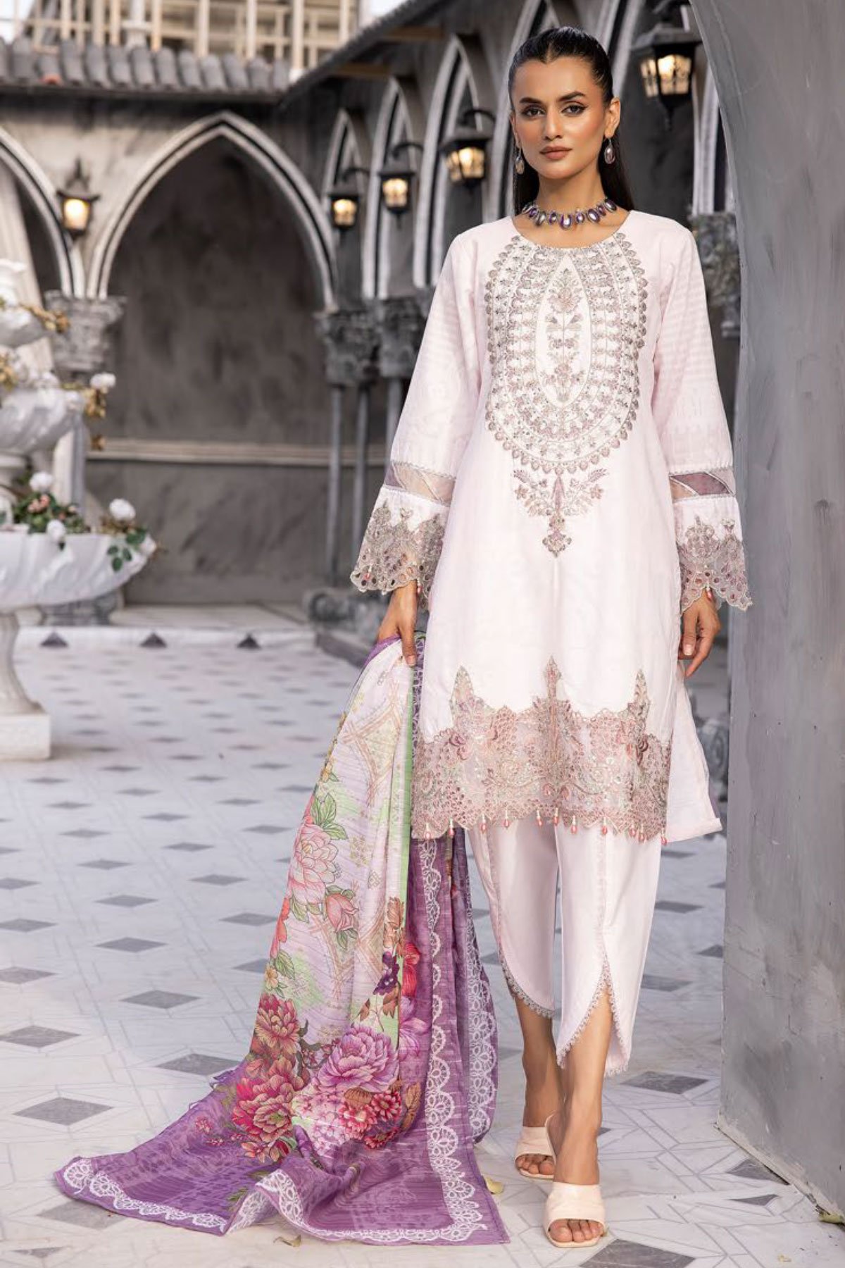 This beautiful 3 piece Zara jacquard collection features a straight shirt features thread work embroidery throughout the front, finished with dangling beads on the border. It comes with full length embroidered sleeves and tulip trousers. The look is finished with digital printed dupatta.