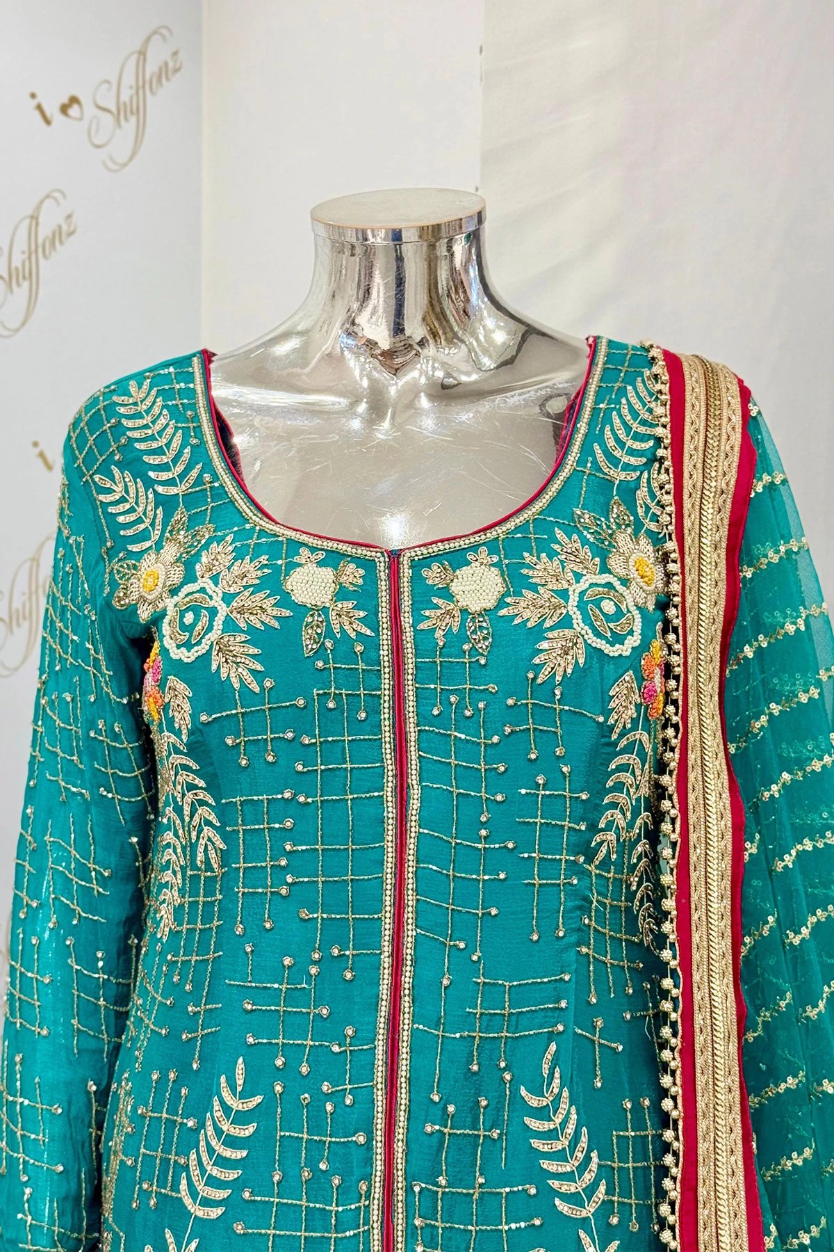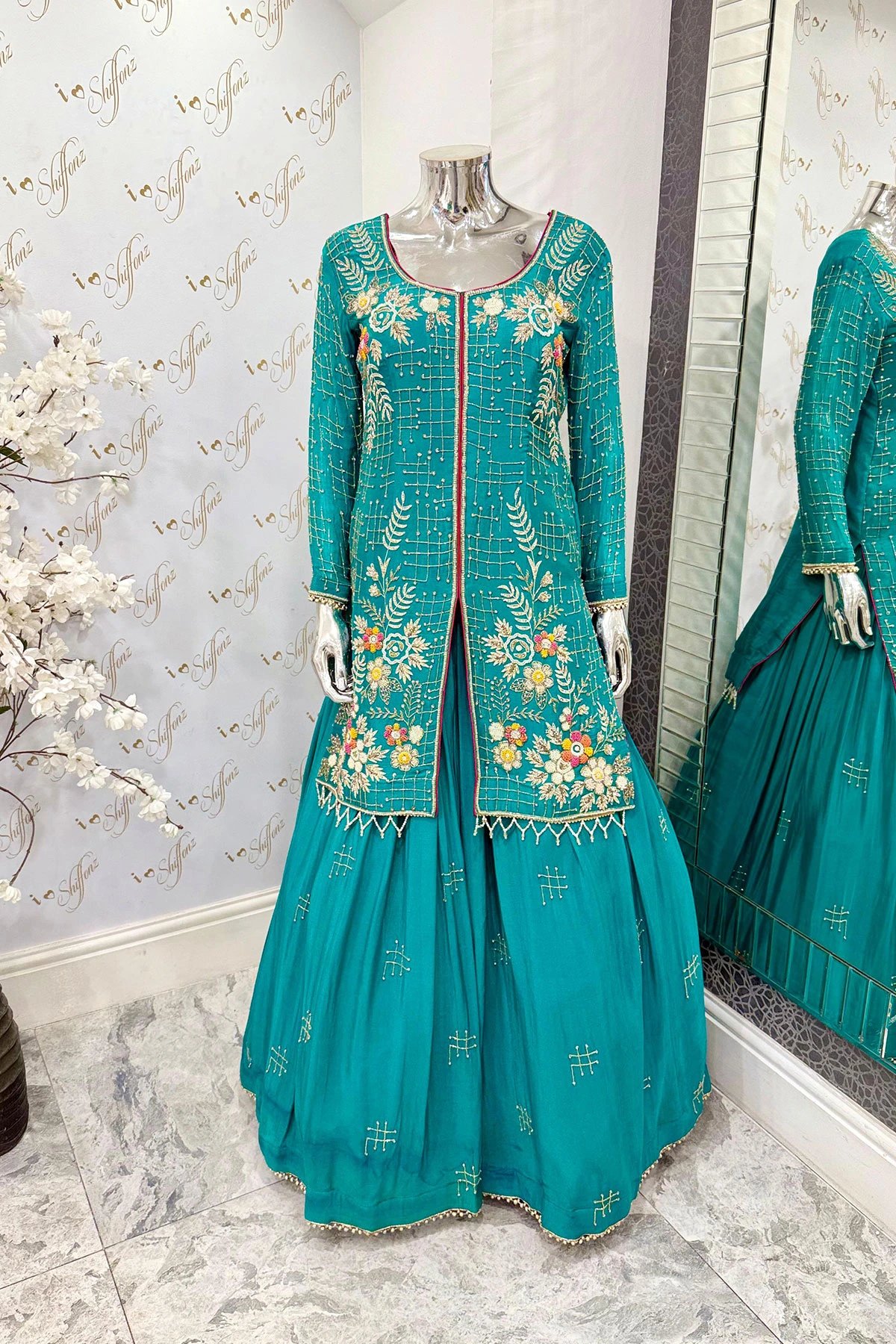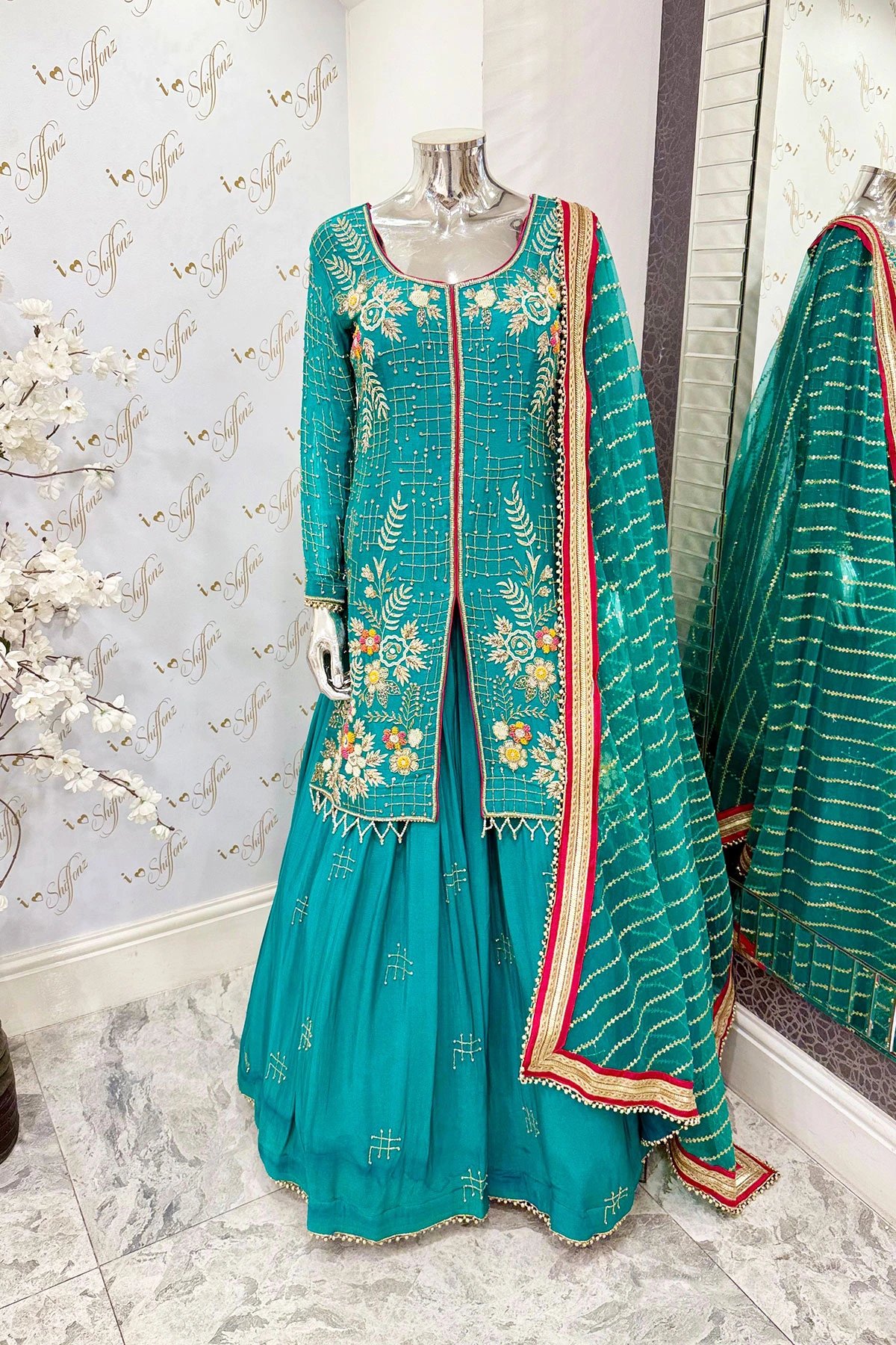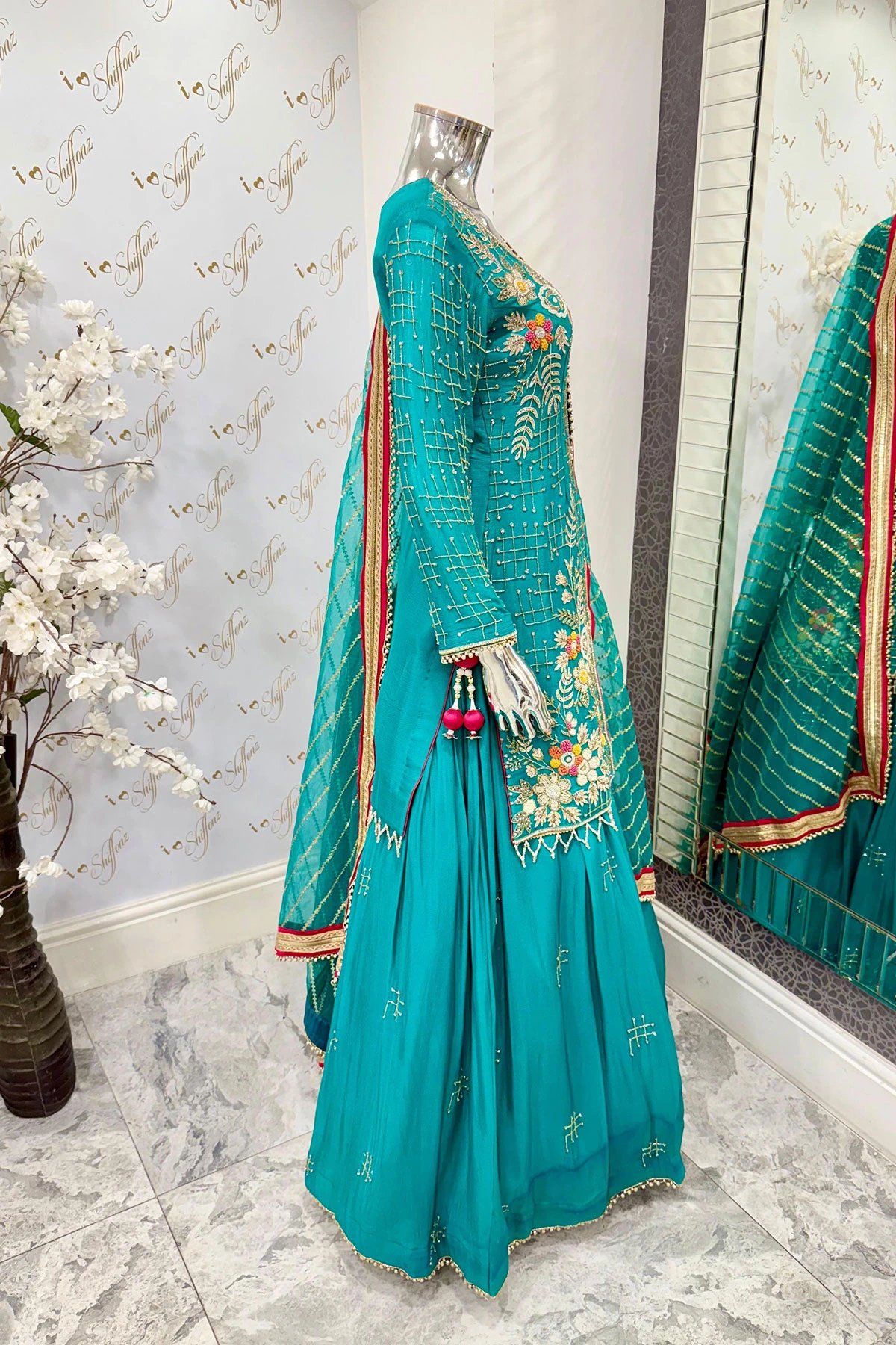 This beautiful 3 piece suit features a straight shirt with luxury embroidered front with a slit along the bottom middle, finished with dangling tassels on the border. It comes with full length embroidered sleeves. Paired with an embroidered lengha with can can attached for a flared look. The look is finished with an organza luxury embroidered dupatta.