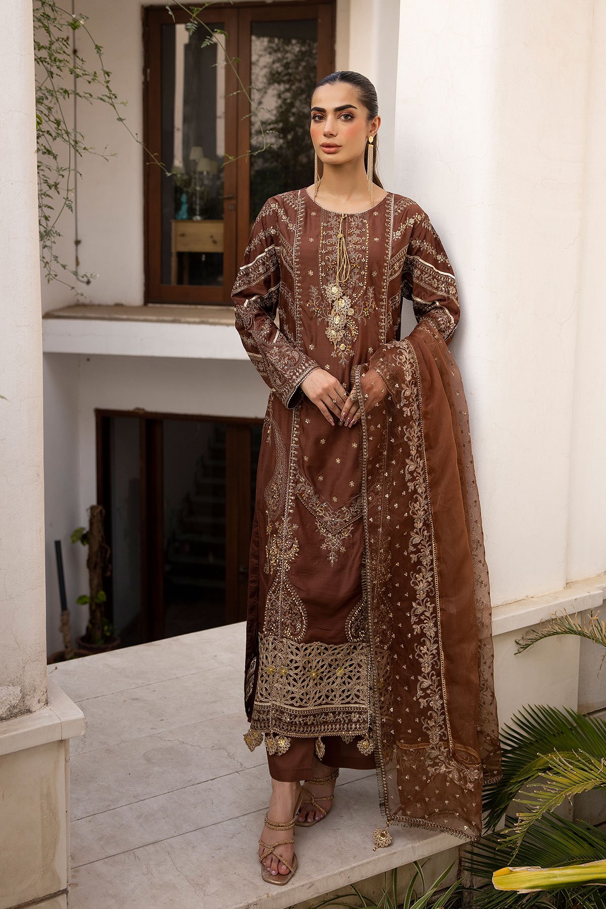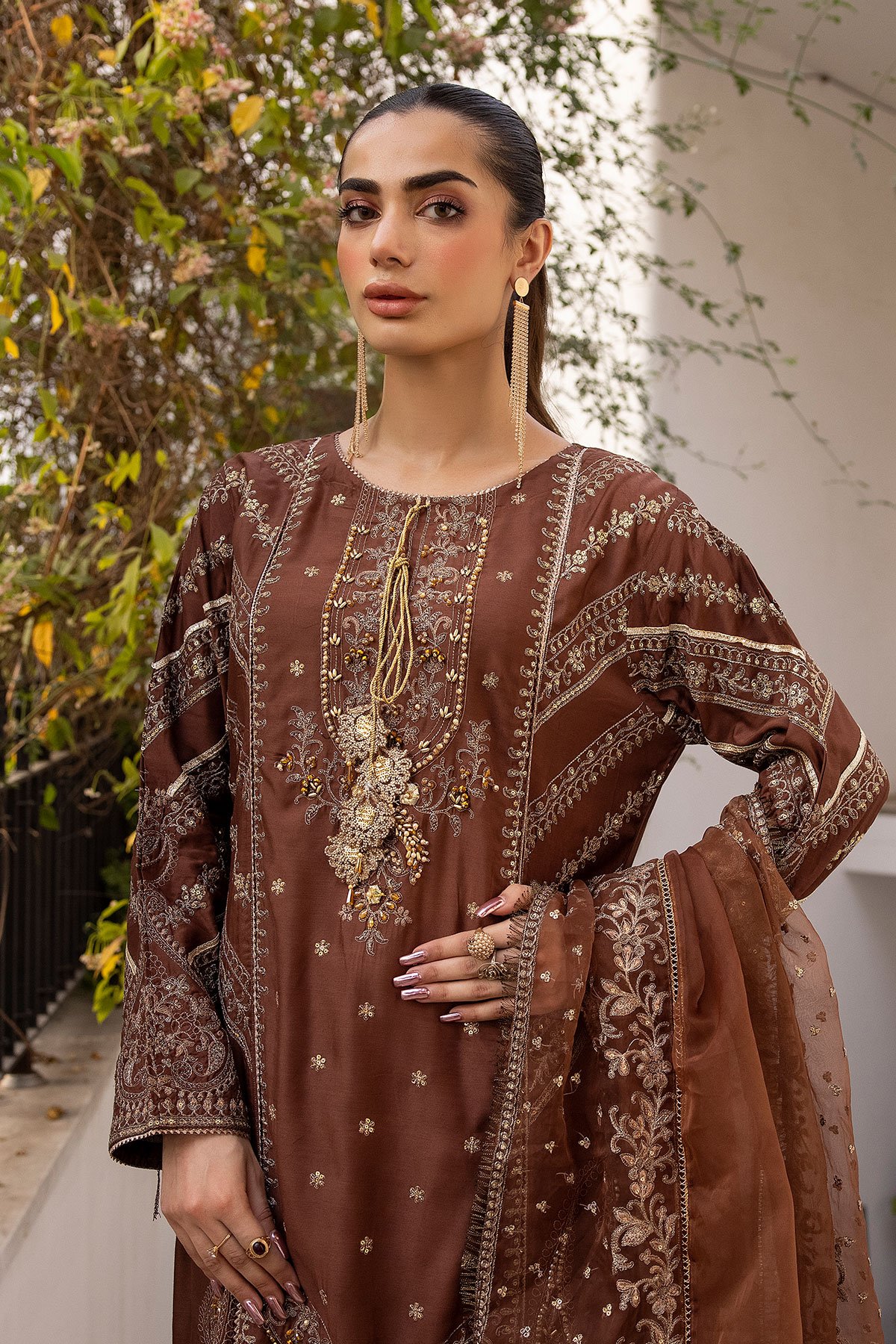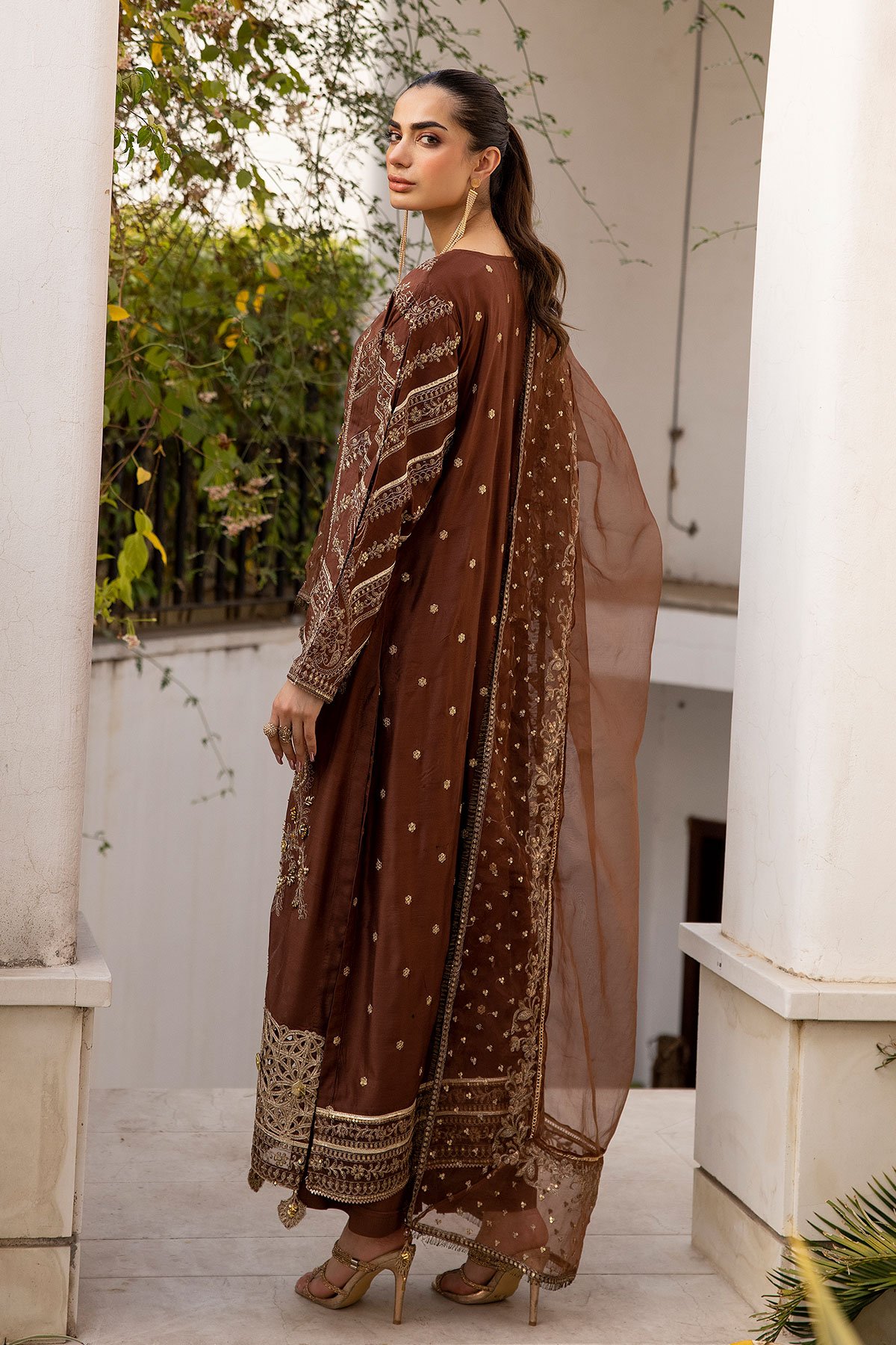 This beautiful 3 piece suit features a straight shirt with luxury thread work embroidery throughout with dori embellishment on the neckline, finished with a cut work embroidered border with danglin fabric tassels. It comes with full length embroidered sleeves and straight leg crepe trousers. The look is finished with an embroidered organza dupatta.