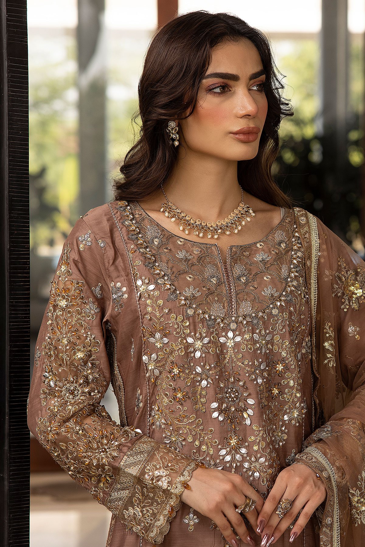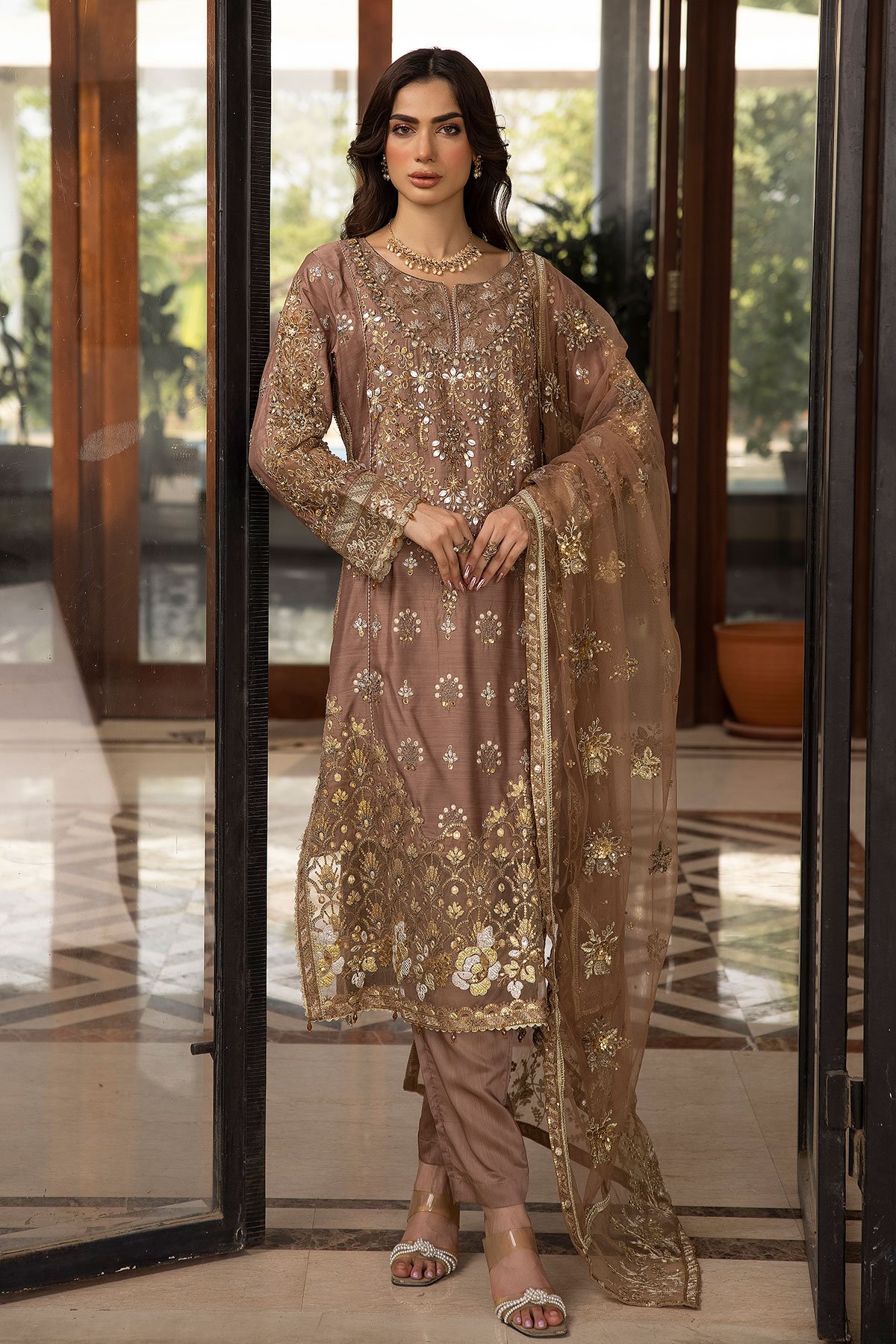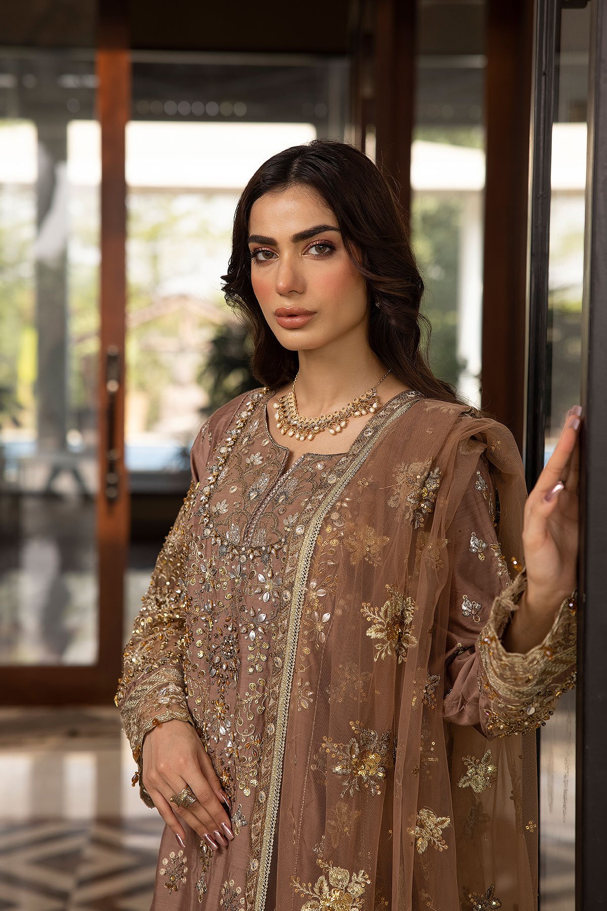 This beautiful 3 piece suit features a straight shirt with luxury thread work embroidery along with sequence and motif embellishments throughout, finished with an embroidered organza border. It comes with full length embroidered sleeves and straight leg crepe trousers. The look is finished with an embroidered organza dupatta.