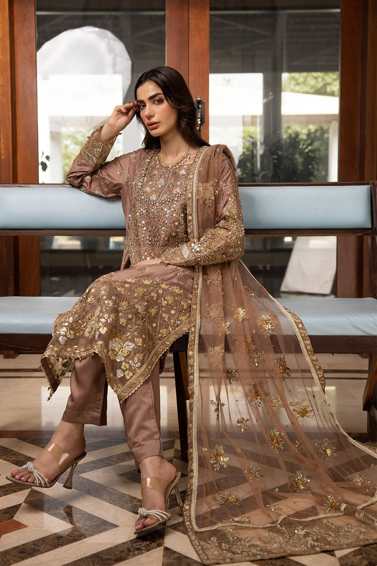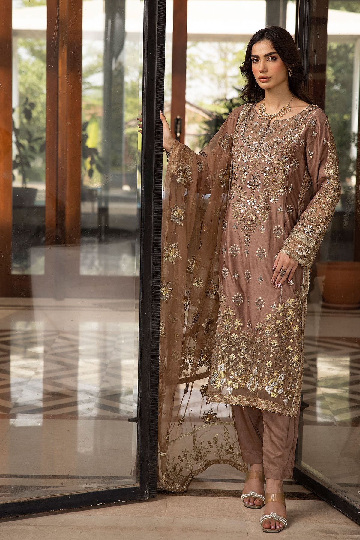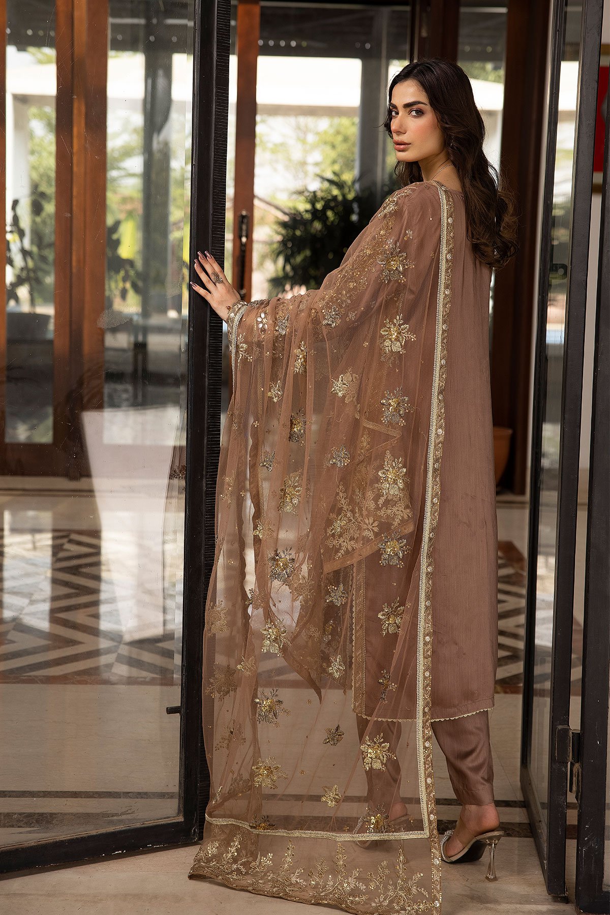 This beautiful 3 piece suit features a straight shirt with luxury thread work embroidery along with sequence and motif embellishments throughout, finished with an embroidered organza border. It comes with full length embroidered sleeves and straight leg crepe trousers. The look is finished with an embroidered organza dupatta.