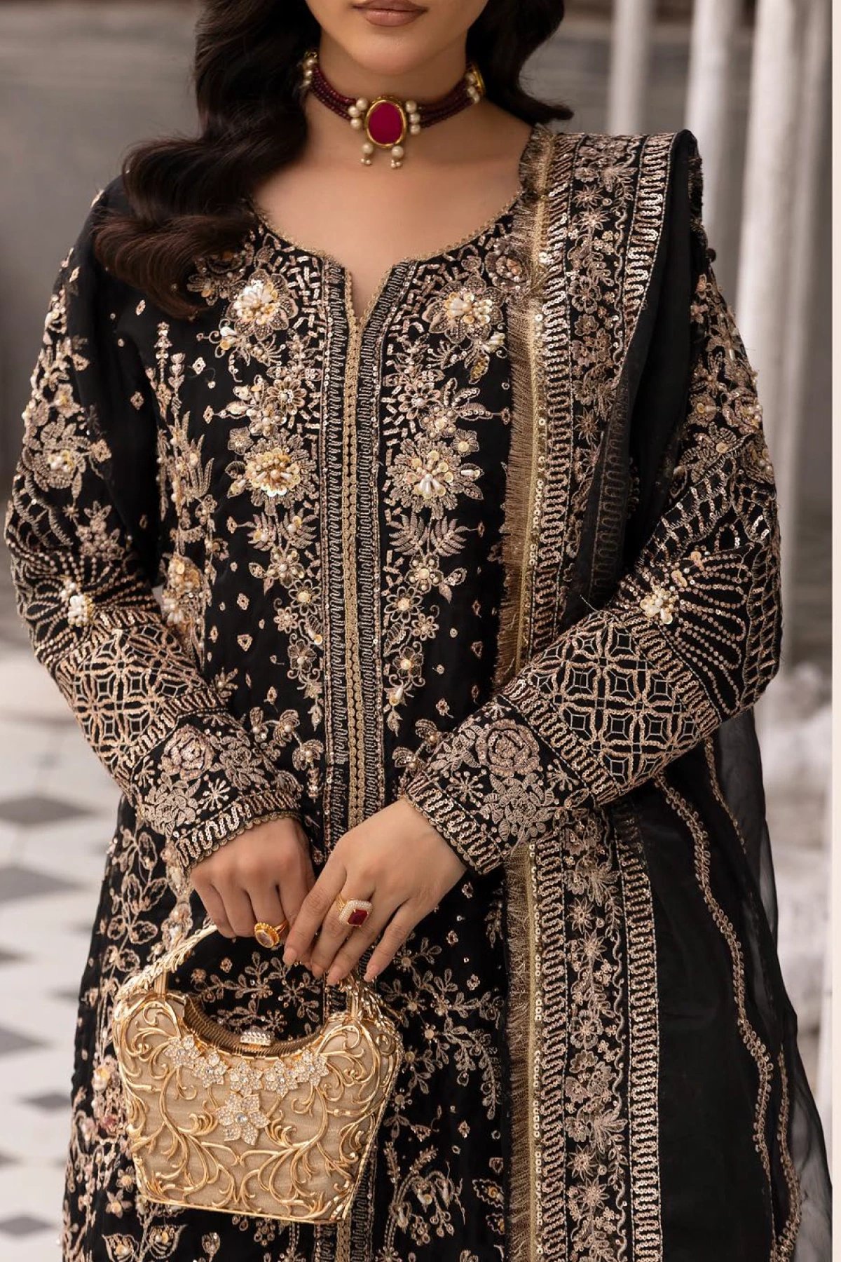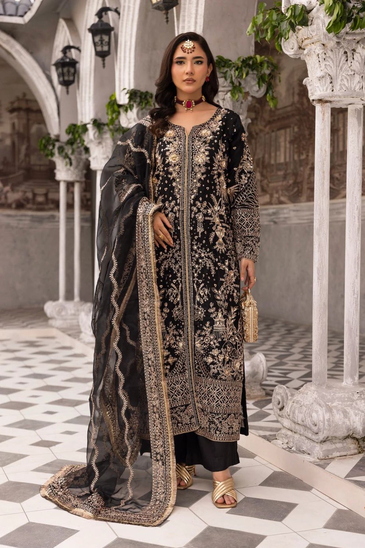 This beautiful 3 piece suit ensemble crafted for timeless elegance. The straight shirt features intricate threadwork embroidery , forming delicate motifs and sequin embellishments that shimmer beautifully. Paired with wide‑leg trousers. The look is finished with an embroidered organza dupatta.