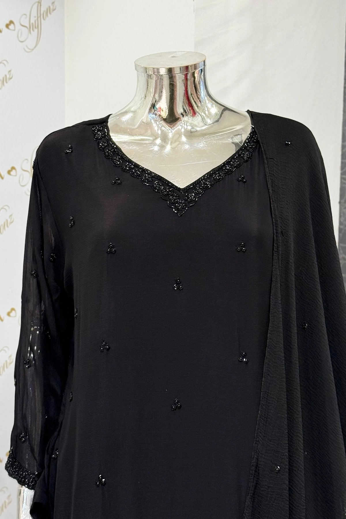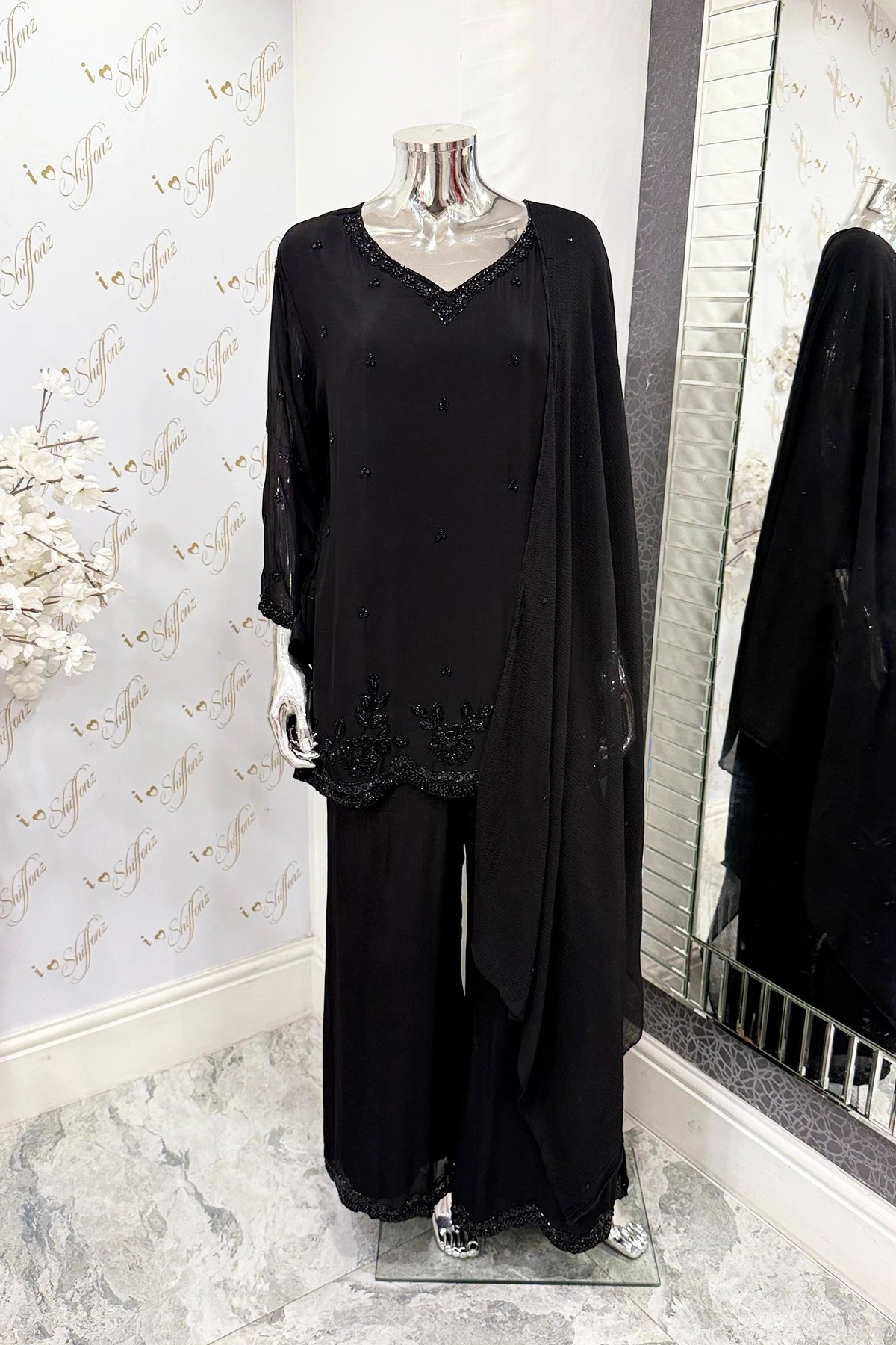 This beautiful 3 piece chiffon suit features a straight shirt with luxury motif embellishment on the neckline and border along with scattered thread work embroidered patterns in between, finished with full length embroidered sleeves. Paired with chiffon plazo trousers and the look is finished with a chiffon dupatta.