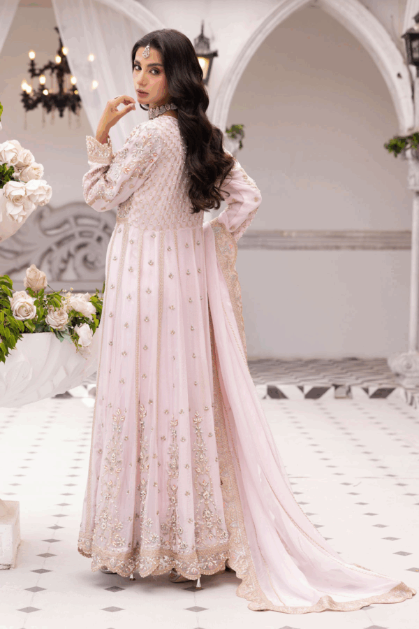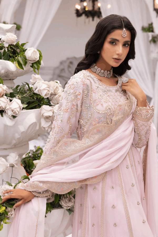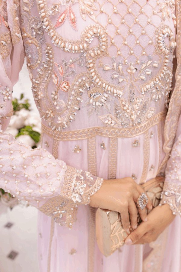 This beautiful 3 piece chiffon suit features a long maxi dress with luxury thread work embroidery with bead embellishment throughout the front, finished with full length embroidered sleeves. Paired with straight leg crepe trousers and the look is finished with a chiffon dupatta.