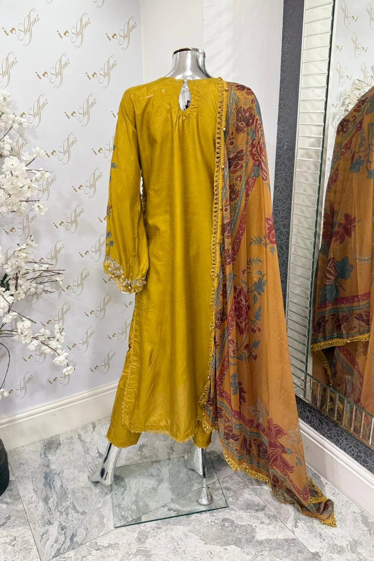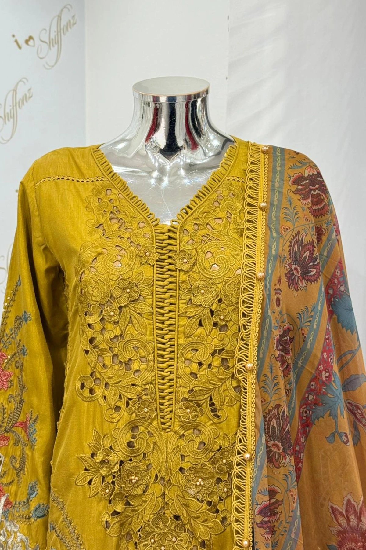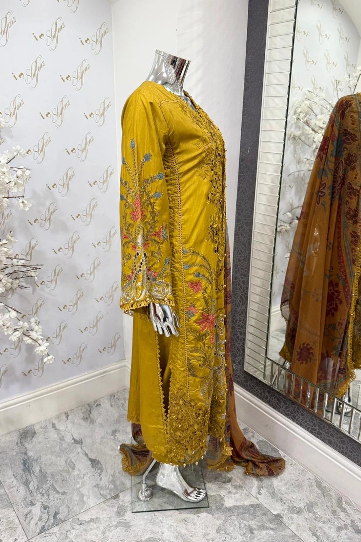This beautiful 3 piece Maria b inspired suit features a straight crepe silk shirt with luxury thread work embroidery throughout with fabric piping embellishments on the front, finished with full length embroidered sleeves. Paired with straight leg crepe trousers and the look is finished with a chiffon digital printed dupatta.